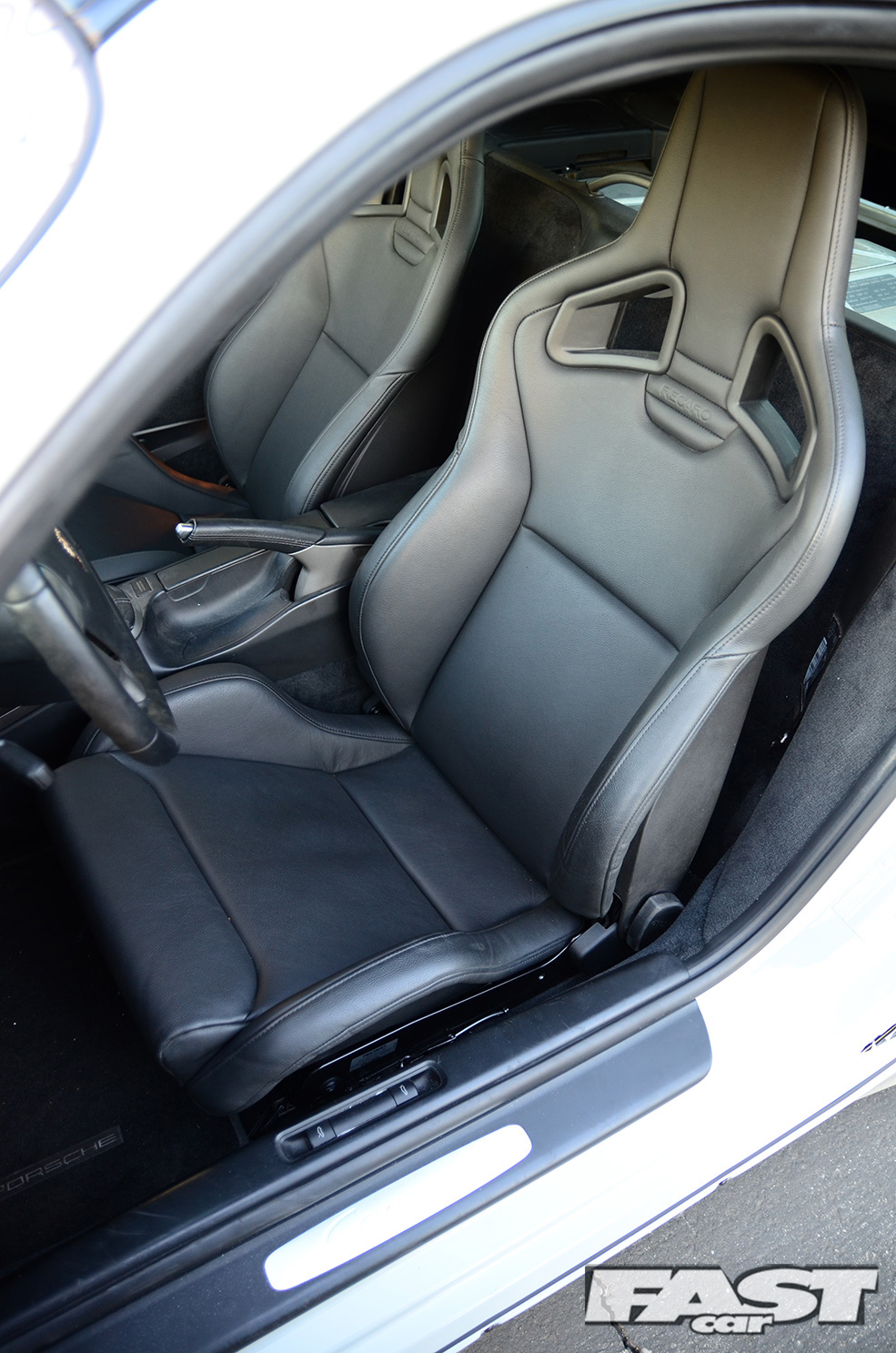 Recaro Sportster CS seats trimmed in leather, Schroth Profi II ASM harnesses, Wedge seat brackets, Jason Noren rollcage, Rennline P45.21.19 pedals, Rennline PE44_45HT red throttle extension, Rennline F15 silver perforated driver floor, Rennline I14.1 silver gearknob, RS door straps