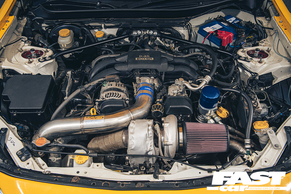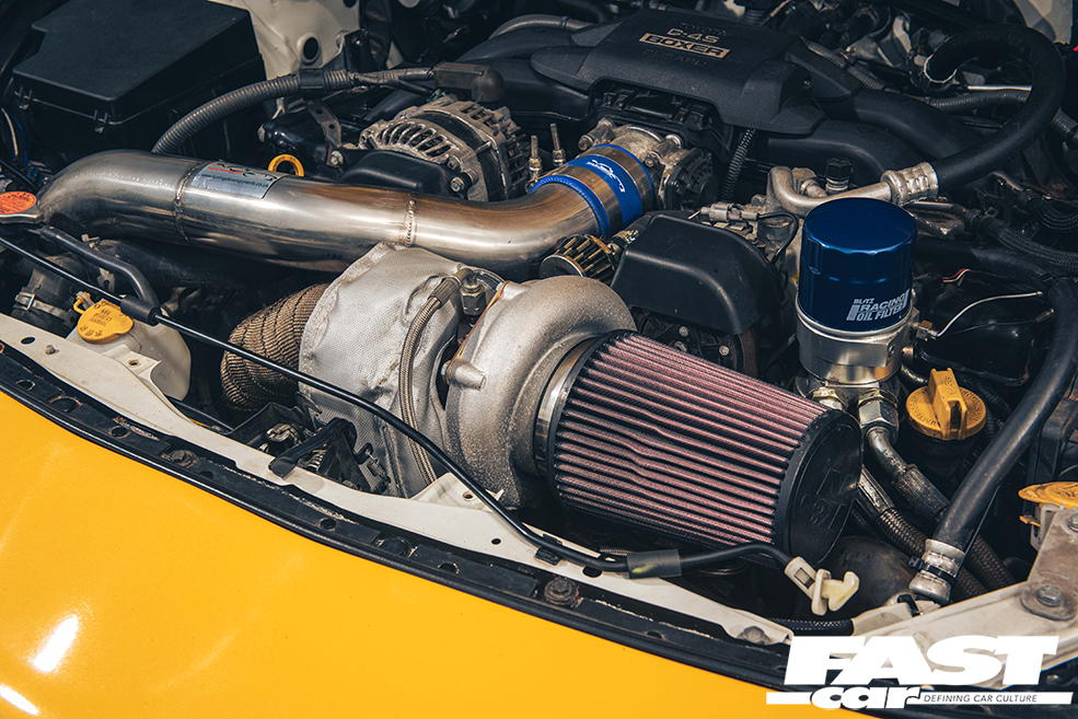 2.0-litre D-4S flat-four, Stage 2 turbo kit with Precision 5558 turbo, UEL manifold, TiAL MVR 44mm external wastegate, screamer pipe, upgraded Omni Power FA20 MAP sensor, 3-port electronic boost control kit, 320lph Tuning Developments in-tank fuel pump kit, 850cc Injector Dynamics port injector set, Mishimoto intercooler, secondary decat, resonated cat-back Tuning Developments exhaust system, oil cooler, oil baffle plate, Blitz sandwich plate, 337.1bhp, 258lb.ft