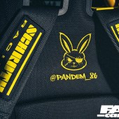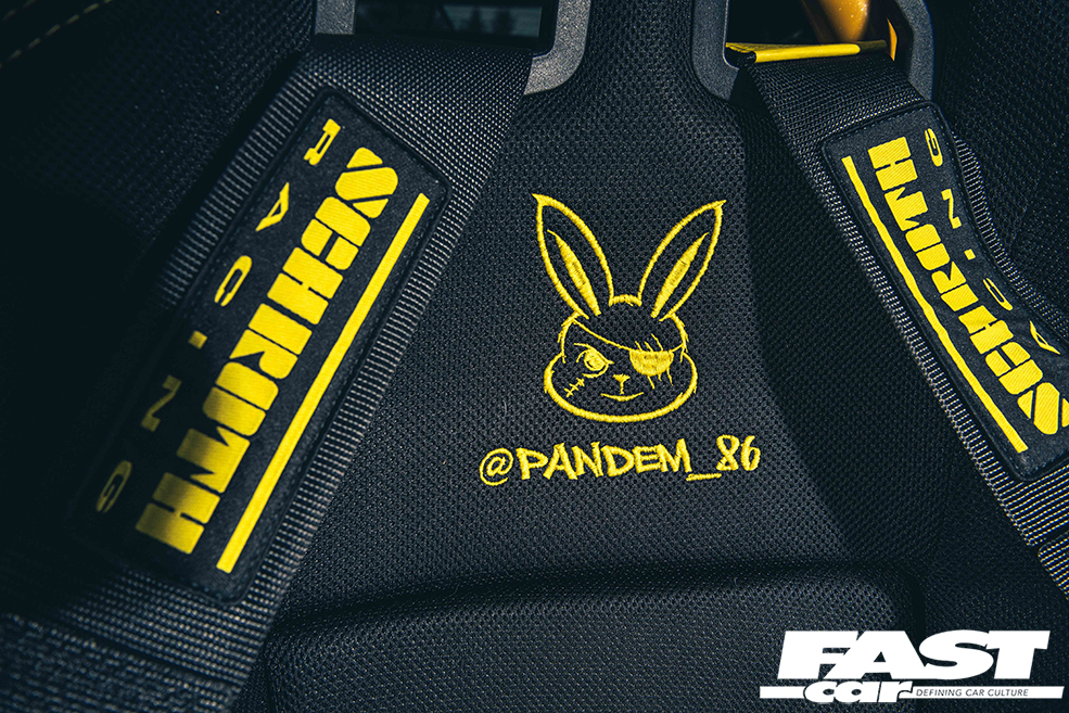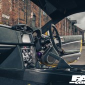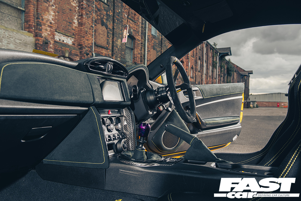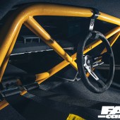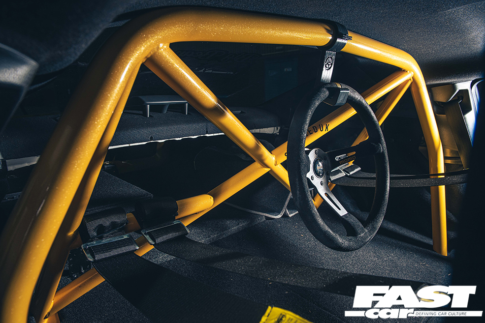 Mirco GT 3D-fabric FIA bucket seats with custom embroidered logos, M2 subframes, Schroth Clubman II ASM 4-point FIA harnesses, custom Alcantara panels with yellow stitching, custom rear rollcage – colour-matched with diamonds in topcoat, suede Momo Deep-Dish Model 08 steering wheel, NRG short hub, Driftworks Race Paddle quick-release, carbon-fibre covers for all interior plastic trim, Airvent 60mm gauge pod, DEPO 4-in-1 gauge (boost, volts, oil pressure and oil temp), Billetworkz Rick & Morty gearstick, Xtrons IN70HGTL 7in head unit, Pioneer GM-D8701 amp, Pioneer TS-A3000LB 1500w 12in shallow subwoofer, Focal IS165TOY component speakers, hidden boot install with twin compressors by Plush Automotive