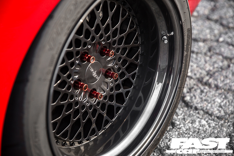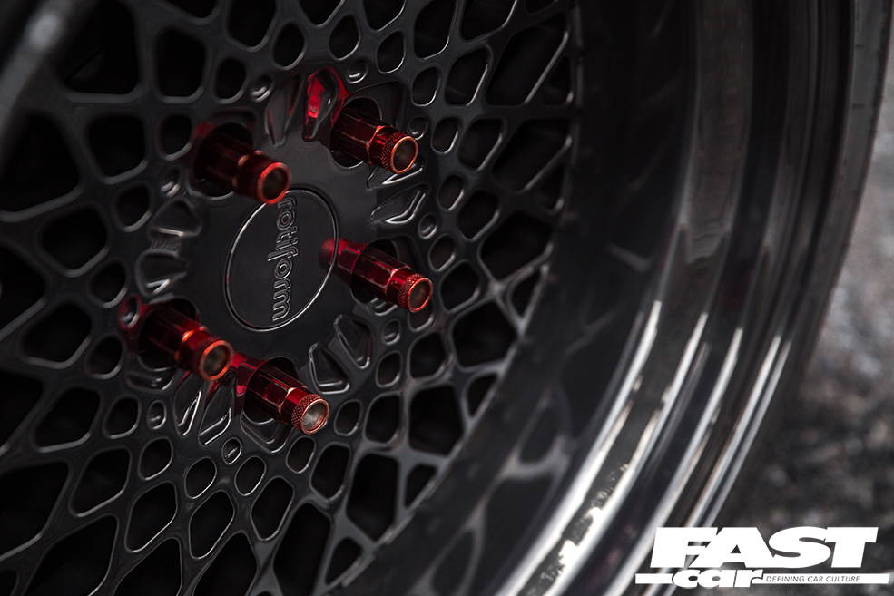 Naturally once you’ve exponentially increased the width of your car, you can’t just leave it on the stock rims. It’d look like one of those embarrassing Rover Metros with a fibreglass 6R4 kit bolted on. But thankfully Will knows whereof he speaks here, being something of an aftermarket wheel aficionado; “I’ve had ten sets of wheels on this car, I change my mind a lot,” he chuckles. “But the Rotiform LHR is a real classic mesh design, I think it really suits the look.” And with 10” of width up front and a striking 12.5” at the tail, the sticky-rubbered rims certainly fill up those colossal arches neatly – especially when Will presses the magic button and airs the thing out.