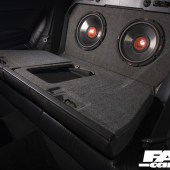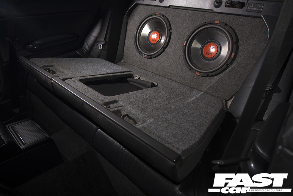 E90 headlight switch, E90 dials, E90 HVAC controls, E90 Start-Stop button, carbon fibre trim, twin Mystery free-air subs.