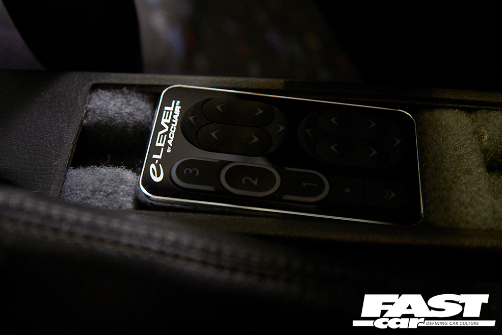 8×17” ET22 (front) and 8.5×17” ET23 (rear) Work Emitz wheels with 215/40 (front and rear) Kumho KU31 tyres, 12mm ECS spacers (front and rear), Air Lift Performance air suspension system, Koni Sport shocks (rear), twin Viair 444c compressors, Airide five gallon air tank, Airide tank top mounting plate, Accuair E-Level management system, Accuair VU4 valve block, Treehouse Racing lower control arm bushes, DBA T2 brake discs (front and rear), EBC Greenstuff brake pads (front and rear)