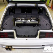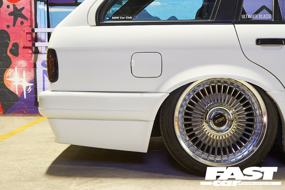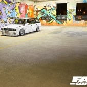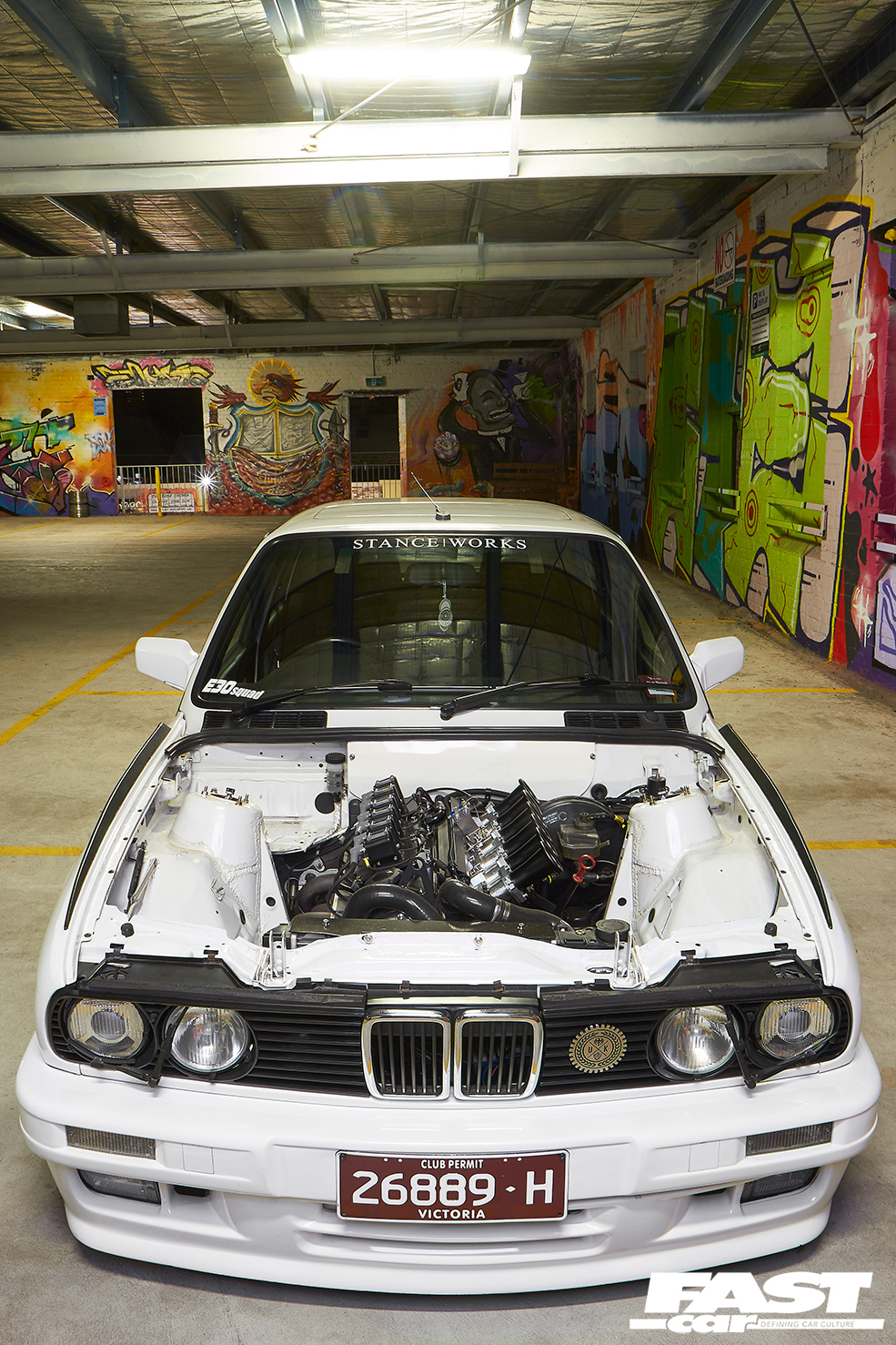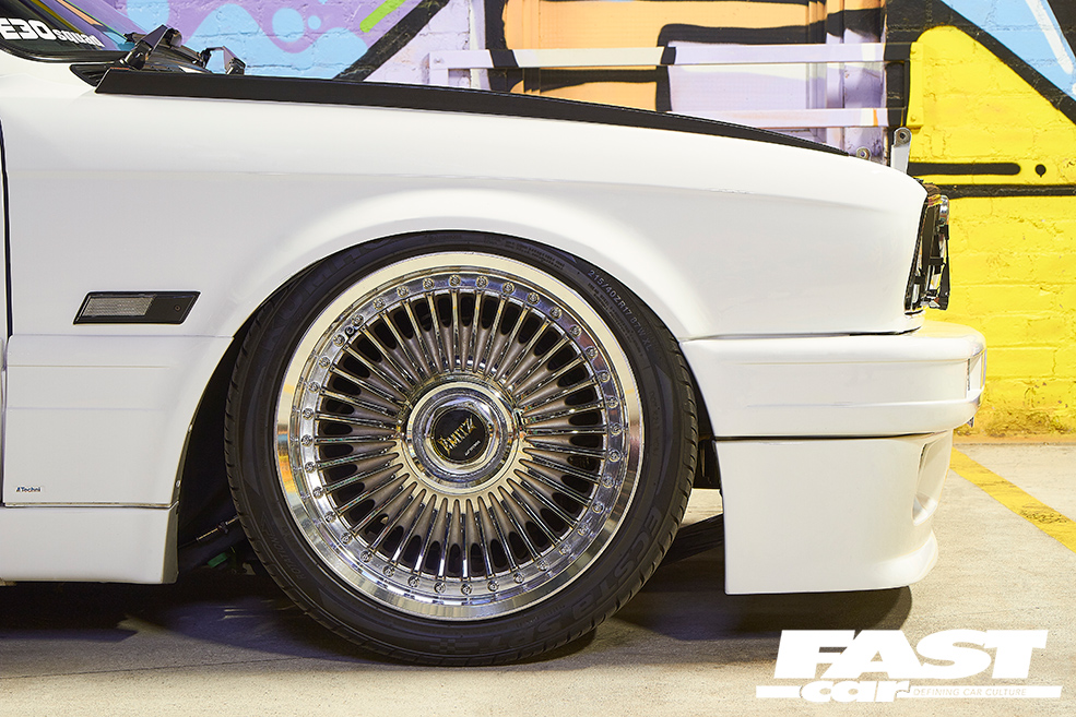 The Emitz rollers are perfectly framed by the E30’s classic lines thanks to another unique part of the build that helps with both looks and speed – an American-sourced, Australian built and owner-fitted Air Lift Performance suspension system, complete with home-made cover for the air-ride tank and twin Viair compressors. Having been ‘defected’ by the local police(forced to return your car to legal levels of modification) for running essentially a race car on the road with his Civic, Michael had no intentions of falling foul of them again, so built up the cover to hide the air system with some MDF, automotive carpet and computer fans to keep the compressors cool. As for the suspension itself, Michael ordered only the bare necessities from the US and the rest locally due to Australia’s poor US Dollar exchange rates, and was able to fit the whole lot himself, having built up significant mechanical skills over years of working on his Civic.