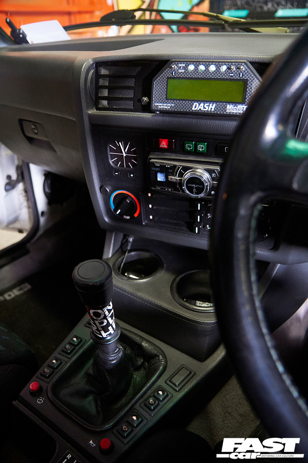 Recaro LS “Confetti” front seats, Microtech LTC dash logger, Condor Speedshop extended and weighted gear knob, Alpina steering wheel, NRG short hub, NRG quick release, NRG hub lock, Alpine IDA-X305S head unit, Alpine ‘S’ series speakers all-round, custom cup holders, DIY air tank enclosure/cover, E30squad floor mats, Viper alarm with full-time GPS tracking