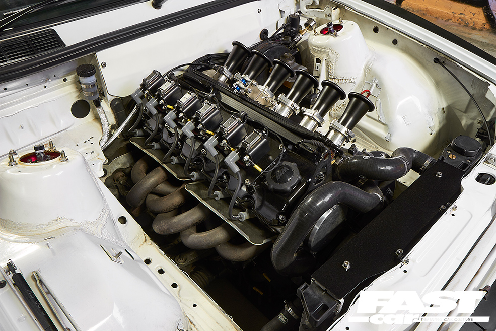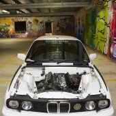 2.5 litre straight-six M20B25, 284° Schrick cam, Nuke Performance cam gear, Nuke Performance fuel rail, AN6 fuel lines, Hybrid Racing fuel pressure regulator, 40mm RHD Engineering individual throttle bodies, EFI Performance 40mm DCOE black velocity stacks, Microtech/Bosch individual coil pack conversion, DIY Coil pack mounting plate, DIY wiretuck, DIY custom blower motor cover, Bimmerheads distributor delete plate, MSD ignition leads, Samco silicone radiator hoses, M42 radiator swap, electric fan conversion, fusebox relocated to under glove box, battery relocated to boot, washer bottle relocated, ABS delete, power steering delete, Haltech Sport 2000 ECU (Microtech LT16c ECU and X6 igniter box at time of shoot), Pure Performance Factory cam sensor kit, Honeywell GT1 hall effect sensor, Raceland exhaust manifolds, single 2.5” exhaust, Xforce Varex 2.5” inlet twin-tip oval muffler, DIY hood quick release pins. Five-speed manual gearbox, UUC Evo3 short shift kit, UUC double shear selector rod, RHD Engineering lightweight flywheel, Sachs HD clutch kit, braided clutch line