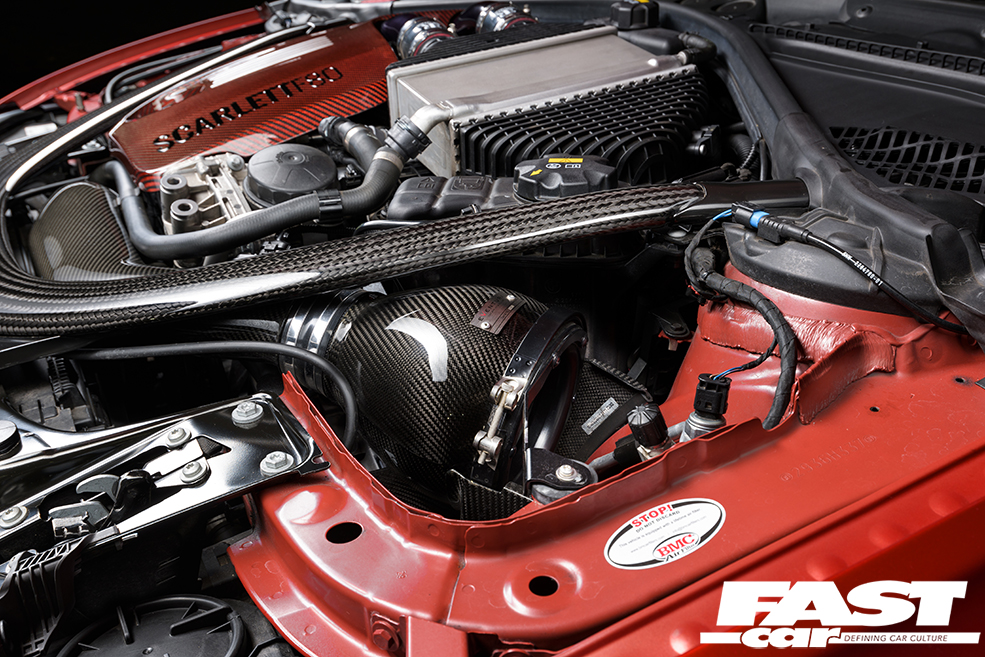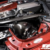 So far we’ve examined what Anand’s done to make his M3 look good, but he’s actually put even more effort into making it go better than it did from the factory, and bear in mind that even standard this is not a slow car. The first thing that strikes you when you pop the bonnet is that engine cover, finished in the same combo of carbon and body colour-matched Kevlar as the seat backs, and finished off with Anand’s IG name. Then you’ll most likely spot the twin Eventuri carbon intakes, which not only enhance the sound of the S55 straight-six, but also seriously enhance performance as well. The stock charge pipes, known to crack once you start turning up the wick, have been replaced with uprated Evolution Racewerks items, and the fact that these have been anodised black is the icing on the cake.
