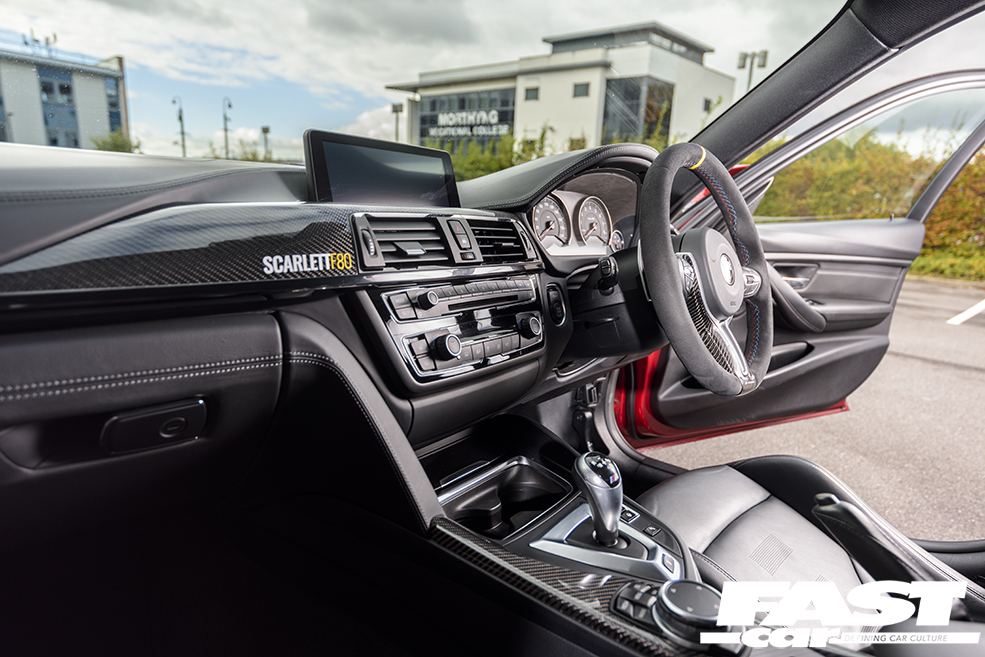 While admiring the exterior shots you would have no doubt spotted the carbon-clad Akrapovic quad tips and Anand has well and truly pushed the boat way, way out on the exhaust front with this incredible system. “It’s a full Akrapovic Evolution Titanium Line exhaust with downpipes,” he says. “It cost around £6100 and it was a tough buy for such a hefty price tag however, in my opinion, it was simply the best-sounding exhaust and still nothing compares. It is very difficult to capture on video but in person it is second to none. The titanium on the exhaust turns a lovely blue after some wear and is a sight to behold,” and he’s not wrong. “One of the best (and cheapest) ways to tune the car was to buy a piggyback module,” he continues. “The JB4 is one of the best and is highly customisable, which is why it was a great choice. It also has some useful features such as map changing on the fly and exhaust valve control which comes in handy very often. This brought the car up to 520hp with my intake and Akrapovic downpipes. This was the norm for most people and is still the height most people aim to reach,” but Anand had set his sights that little bit higher for his M3… When the Competition Pack and M4 GTS were released they brought with them an almighty increase in exhaust cacophony, with all manor of thunder cracks emanating from the pipes, and Anand wanted a piece of that action. “Aftermarket tuners jumped straight on this and started offering ECU tuning which enabled this sound using the ignition timing. I decided to stack my JB4 with this tune to run even higher boost and enable that epic noise and I am now running 575hp with all of the engine mods.” 575hp. That’s straight-up outrageous and it takes this M3 to a whole other level as far as performance is concerned, which is quite an achievement considering just how quick the standard car is.