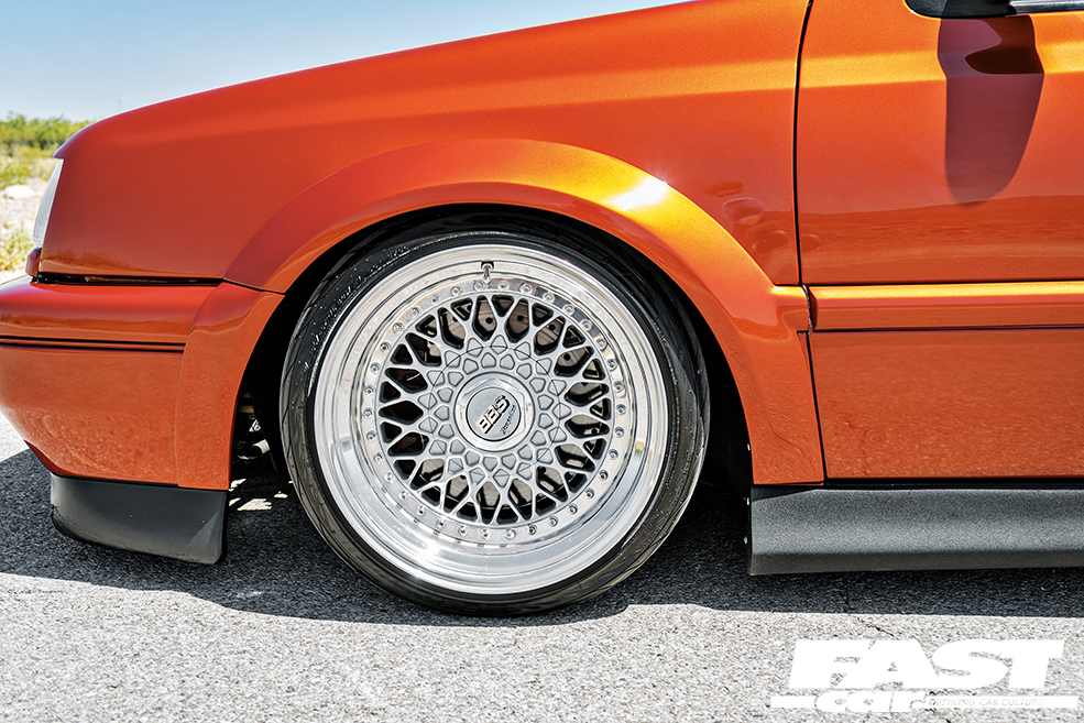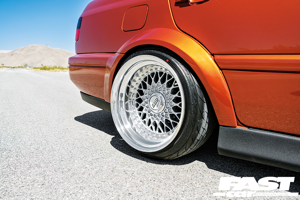 9.5×16” and 10.5×16” BBS RS with Federal 595 tyres. CX-Racing coilovers, Neuspeed anti-roll bars, polybushed throughout, tie-rod flip kit and chassis notch. Mk1 TT front brakes, VR6 rear brakes, EBC pads, stainless steel lines