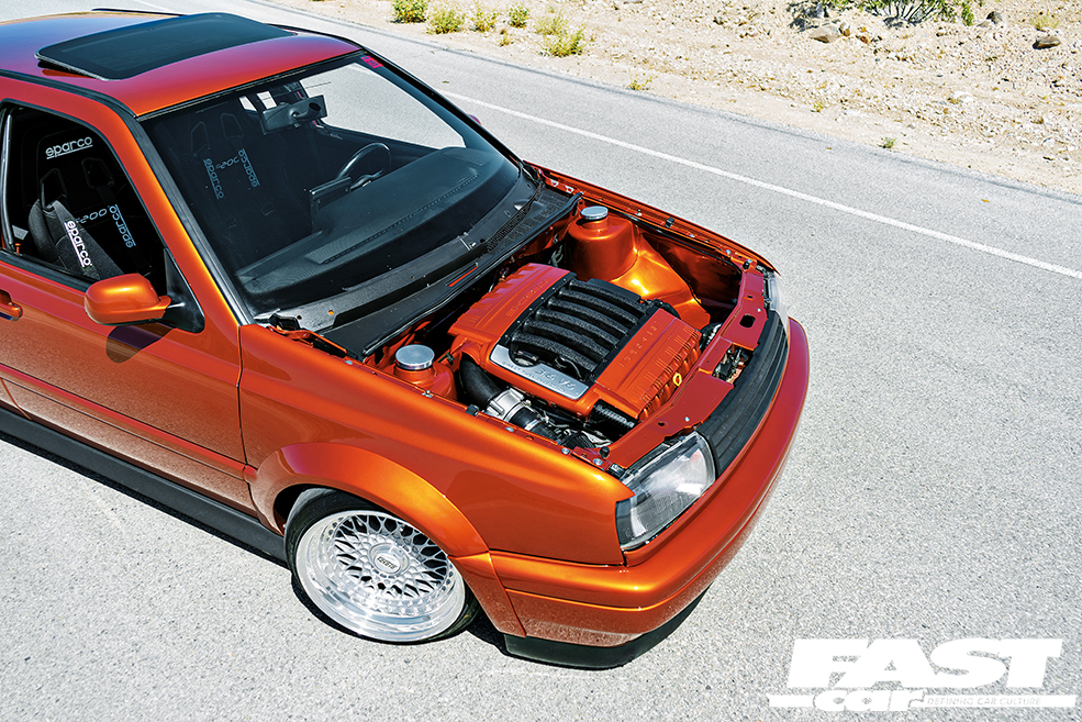 The mechanical misstep put Mike and car out of action for over a year but what he spent that time doing was well worth it when you check out what’s under the hood. “I wanted to do something that hadn’t been done before here in Southern California which was a 3.6 swap. Putting it in was the hardest part of the whole car, I didn’t have anyone to bounce questions off and had a couple of mishaps at first with a faulty harness and ECU which added to the time it all took,” he added. Mike didn’t just drop the big six-shooter in the bay though, he decided the bay itself needed smoothing and tidying up too, which as we all know is a big enough job in its own right. “If I could do it again I would have bought the motor from the sedan rather than the SUV. There was a lot of modifications needed in order to get it to fit and run properly in the Mk3.” Mike swapped the original manifold over to one from a Porsche Cayenne and the intake, crank pulley, downpipe and the hidden power steering tank were all fabricated by him himself. Most people would be pretty happy with the power of a 3.6-litre six-pot in a Mk3, but Mike figured it needed a little extra shot in the arm with a 120-shot wet nitrous system and a United Motorsports map. The car puts its power down through a built O2A ‘box with a Katz LSD and TDI 5th gear swap with a Stage 2 clutch and a 9lb billet flywheel holding it all together.