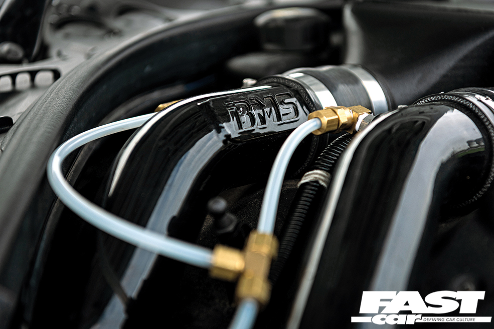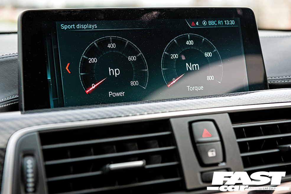 The key to all that power is the pair of Pure Stage 2+ turbos that have been fitted and they are joined by a seriously strong supporting cast of performance upgrades. There’s a custom methanol injection setup based around a Torqbyte controller, a Maximum PSI crank hub, a set of Wagner radiators, a Wagner chargecooler and DCT cooler, VRSF cold side charge pipes, BMS Elite hot side charge pipes, ITG air filters, NGK gapped spark plugs, VRSF cat-less downpipes and an AA mid-pipe, while everything is overseen by a bootmod3 F80Paul Stage 3 map with several different switchable maps for different fuels plus meth for each one. That’s some seriously heavyweight performance upgrades and they add up to an incredible amount of power; “The car has only been dyno’d on the V-Power plus meth map, using a Dynojet,” explains Ali, “and it made 802hp and 671lb ft of torque; on this map the car does a 5.02-second 100-200km/h (62-124mph) time and at VMAX200 it did 201mph, from a standing start,” and that’s incredible stuff, but that’s just for starters. Once you get off the pump fuel and onto the hard stuff this S55 kicks things up a notch and it’s clear that this engine is deep into 800hp+ territory. “On the race fuel map it has done a 4.9-second 100-200km/h time while on the E85 map it did 4.78 seconds and 60-130mph in 5.7, which makes it the fastest stock-engine M4 in the UK,” smiles Ali and that’s awesome stuff, and is especially impressive considering it all began with just a map…