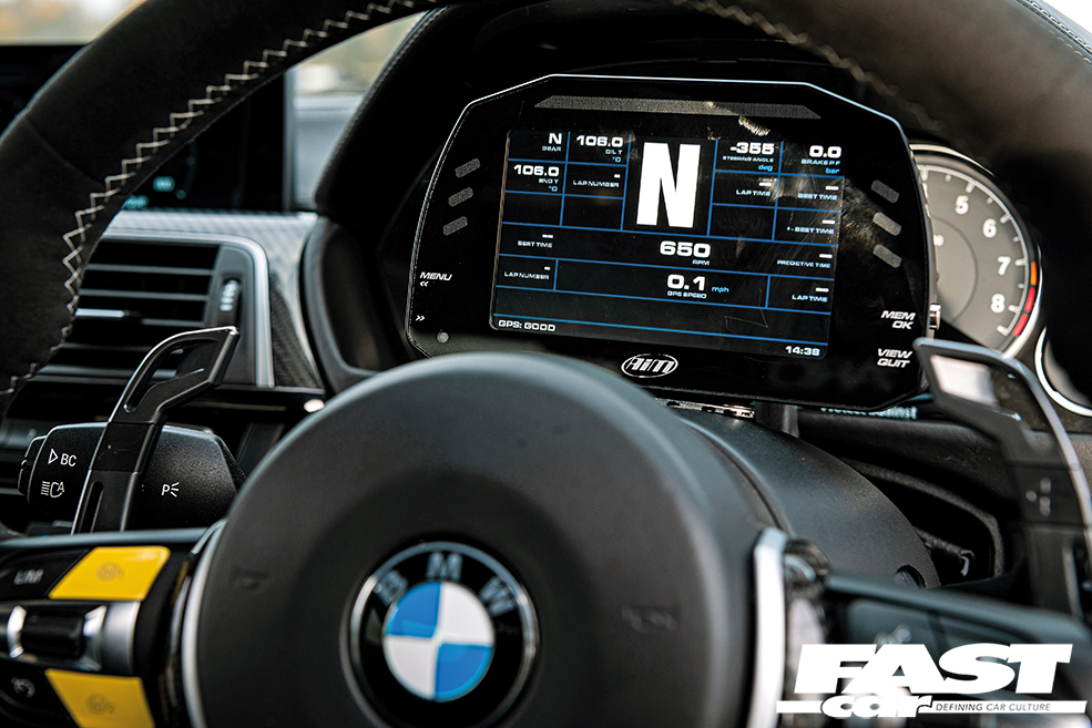 The interior has also been treated to a nice selection of upgrades both in terms of appearance and from a performance point of view. “The M4 DTM and GTS were heavily involved in my design choices,” Ali explains. “The Recaro Pole Position seats were a must, as I found the factory seats very unsupportive and I also wanted to install a rear roll-cage and harnesses for track use,” he adds. Pole Positions remain one of the sexiest seats you can get your hands on and they look fantastic in any BM you care to mention and suit this build perfectly, as well as delivering the added support that Ali was looking for. There’s plenty more going on in here, with an M Performance steering wheel, complete with suede rim and red centre stripe, and it’s been customised with the addition of a pair of yellow M buttons from IND and a set of gorgeous billet extended paddles, and there’s also a yellow start button from IND. An Aim MXS 1.2 racing data logger is mounted on the steering column when the car’s being used at events and there’s also an M Performance handbrake, armrest and DCT surround plus a full carbon trim kit for that finishing touch.