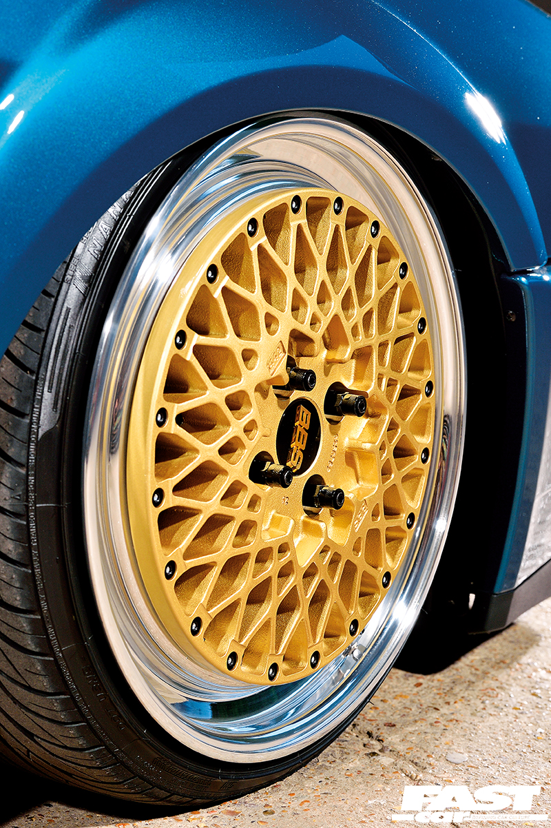 8×17 BBS E50 three-piece (4×100 magnesium centres), 0.5” lips all round with GT50 stud conversion and black and gold BBS badges. Air Lift Slam struts with V2 Air Lift management, custom boot build with hard lines finished in black with black chrome coated tank. Tarox six pots with two-piece 300mm discs, Tarox discs on rear too, braided brake lines throughout