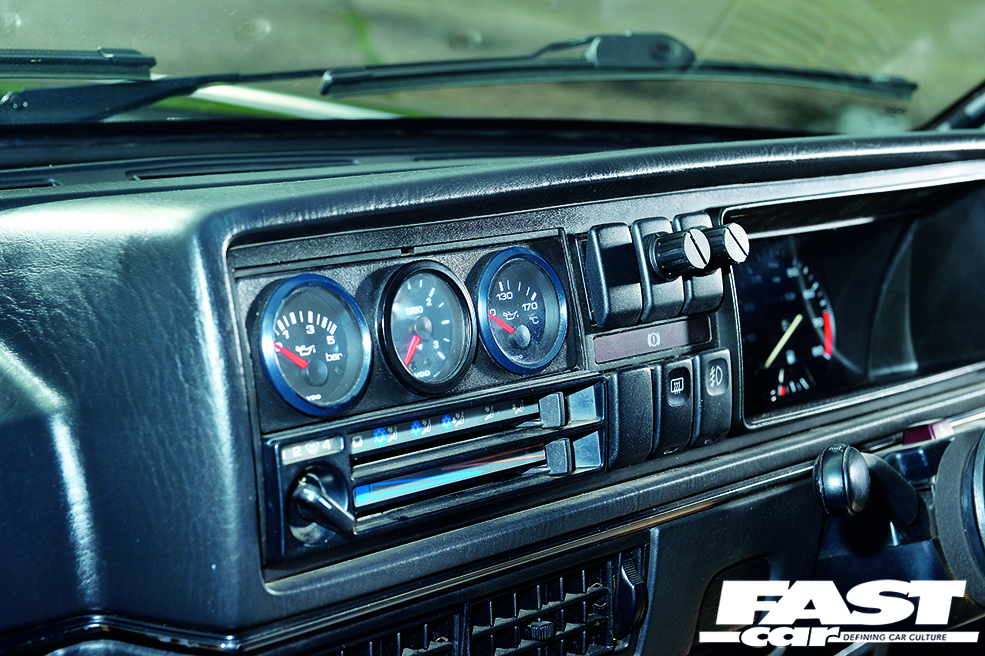 Factory Rallye trim and seats retrimmed with new centre fabric, retrimmed door cards in original material, custom door pods/speakers, custom carpet, Momo Team 300mm steering wheel, headunit relocated in dash under shelf, VDO coil pressure, oil temperature and turbo boost gauges, right-hand-drive conversion