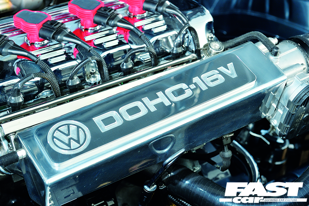 2.0-litre ABF 16v from a Mk3 Golf with cylinders bored out 0.5mm to 83mm, forged Wossner low-comp pistons (9:1), forged ZRP connecting rods, balanced crankshaft, lightened and balanced flywheel, block painted and cylinder head vapour blasted to original aluminium appearance, modified and chromed plated VW cam cover, custom made inlet manifold which has been chromed plated, Bosch drive-by-wire electric throttle body, chromed and rebuilt alternator, Audi TT 1.8T fuel rail modified and polished, Bosch 440cc Green injectors, VW/Audi coil on plug assembly, custom turbo exhaust manifold, Borg Warner EFR6258 turbo with polished compressor housing, Forge Motorsport waste gate modified to fit, custom stainless downpipes and full stainless exhaust system, external Mocal 13-row oil cooler, original Rallye intercooler, custom aluminium radiator with silicone hose and top fill set-up, Emerald ECU and custom wiring harness routed through chassis leg with new plugs/connectors. Original Rallye gearbox rebuild, Audi TT gearbox shifter tower and counterweight come plated, Libra Technic engine mounts, Audi R8 oil cap, distributor blanked off with custom polished cover, chrome-plated water hose, all bracket powder coated or chrome plated. New Bosch 044 fuel pump and filter, billet aluminium Torques pump and filter with custom fuel accumulator bottle. Custom fuel hoses with AN fittings. Electric PAS system