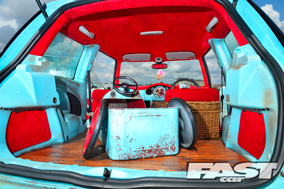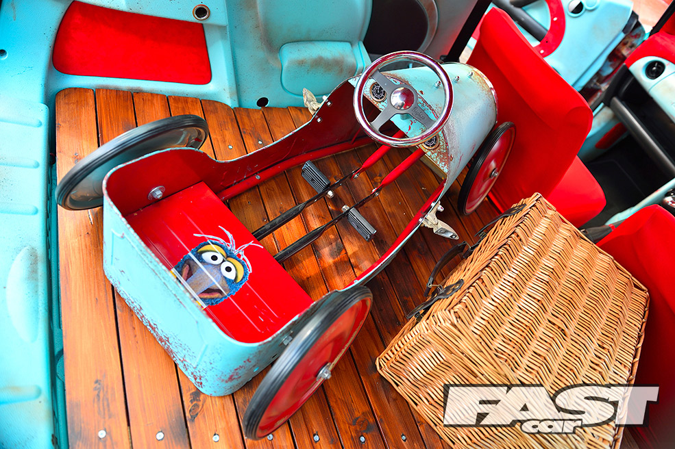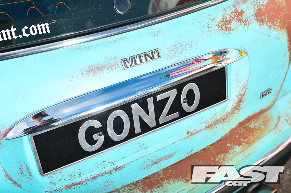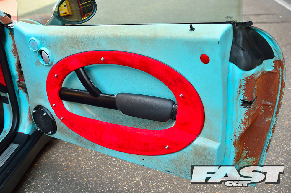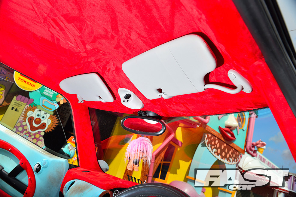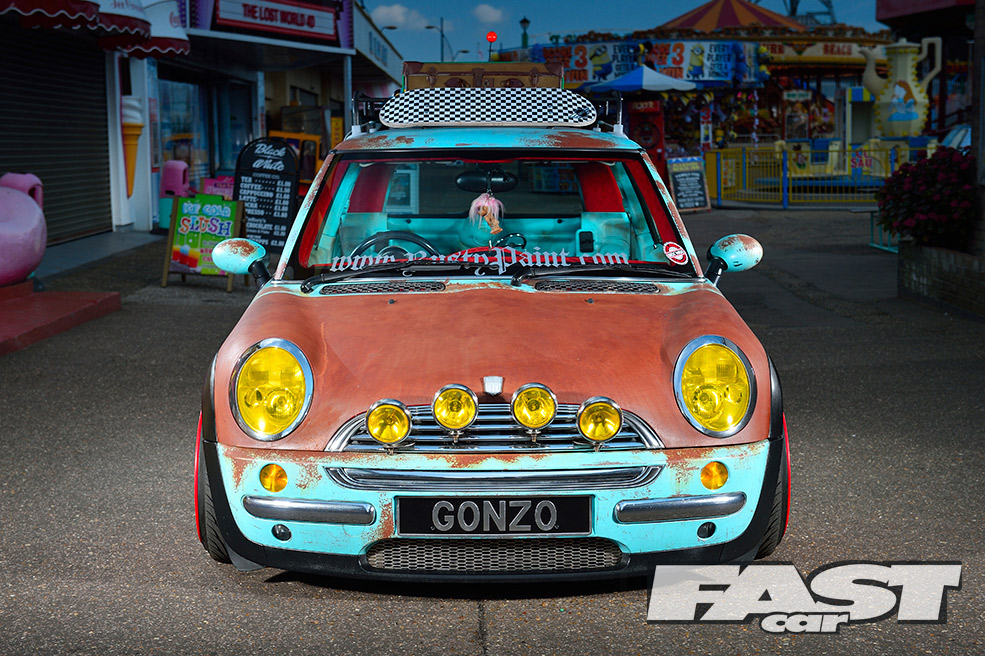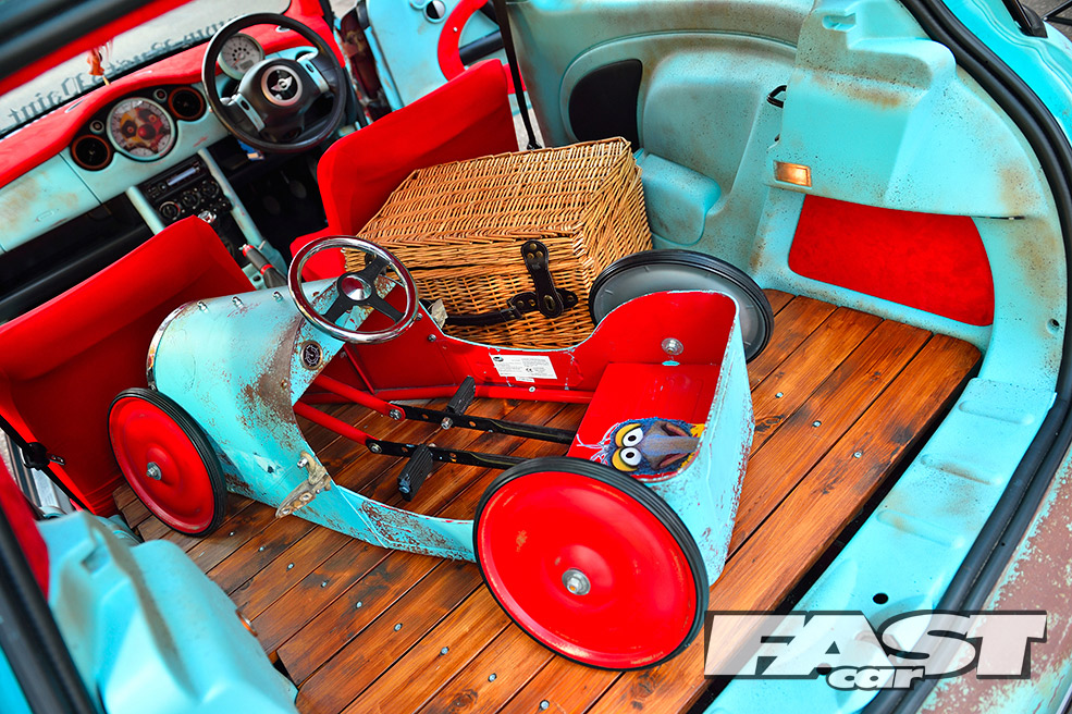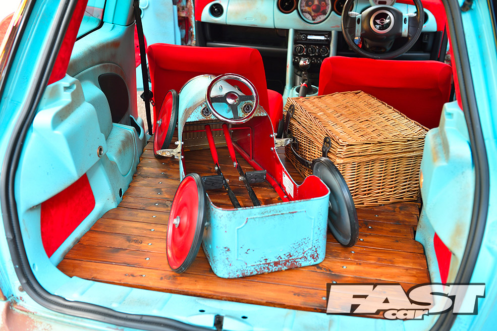 While the ratty exterior settled in nicely, a cuddly Gonzo, that phallic-nosed muppet, was hung off the ’60s roof rack. Attention then turned to the standard interior, which was far too straight-laced for this project. “My father-in-law sadly passed away, leaving three classic Minis rotting away in his front garden,” says Karl. “So I salvaged a pair of front seats from one, some badges from another and gave the rest to a local Mini club.”