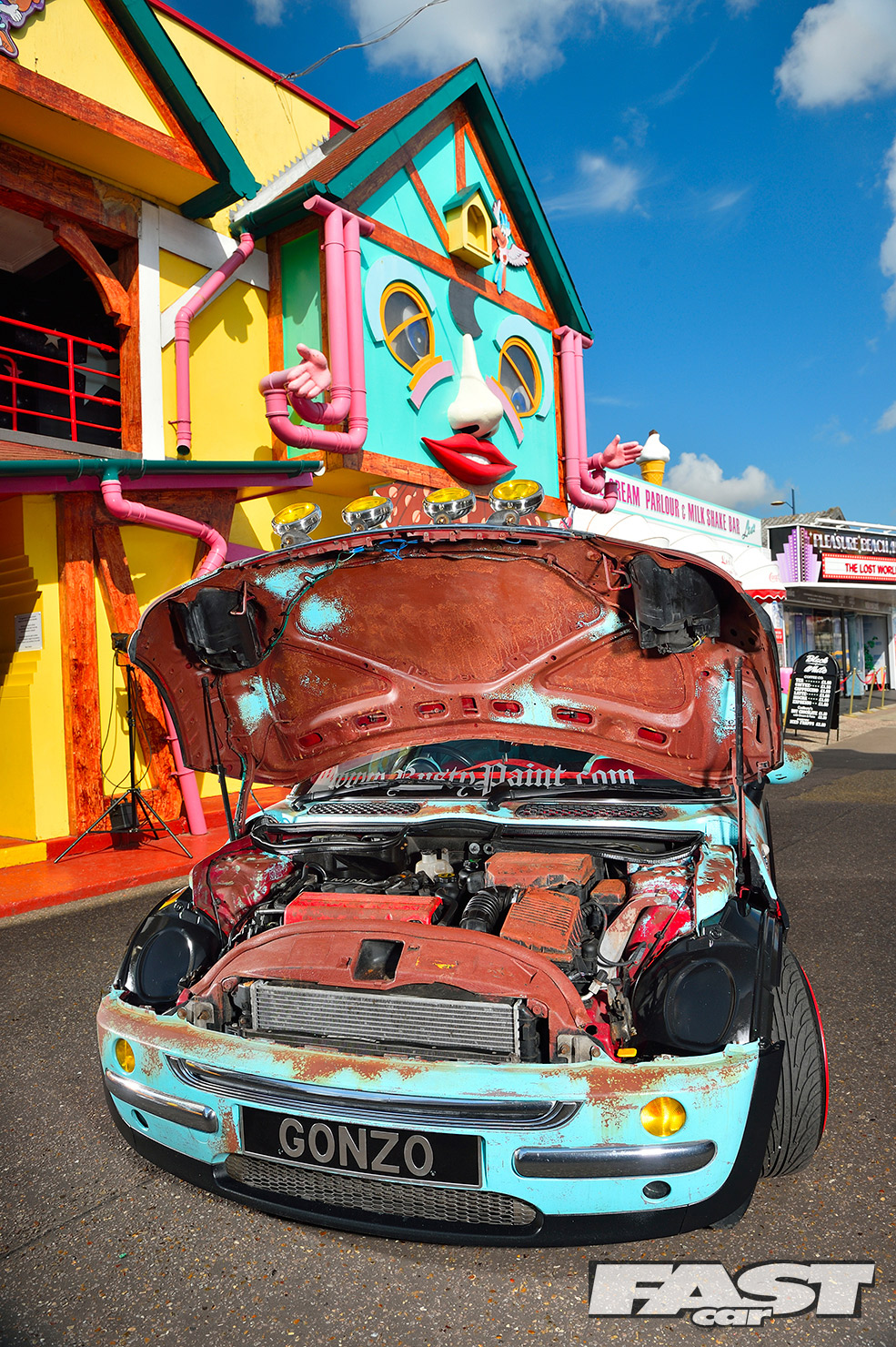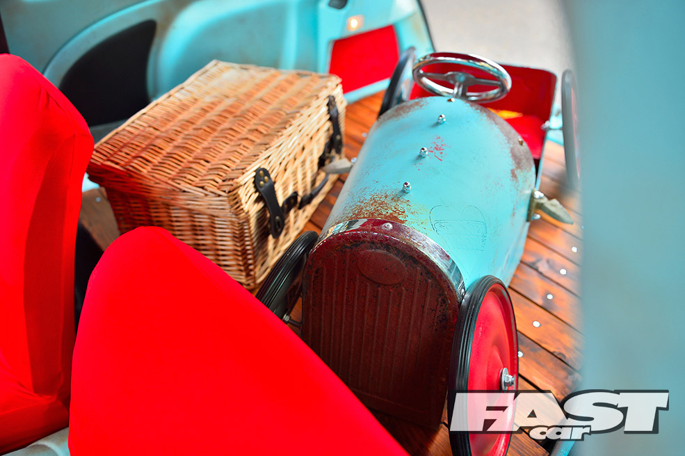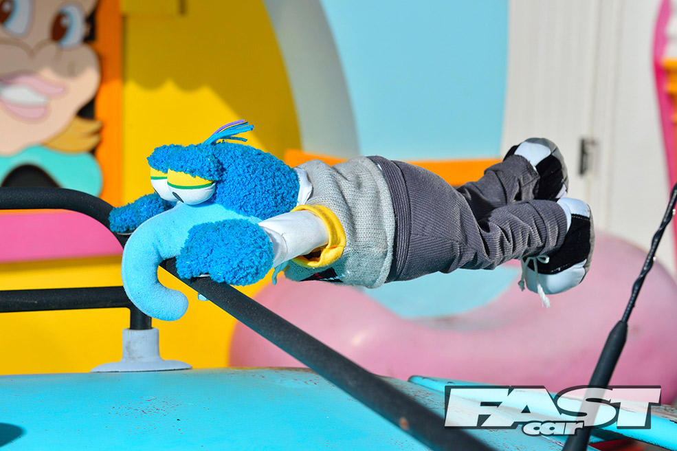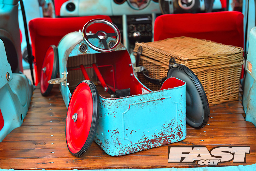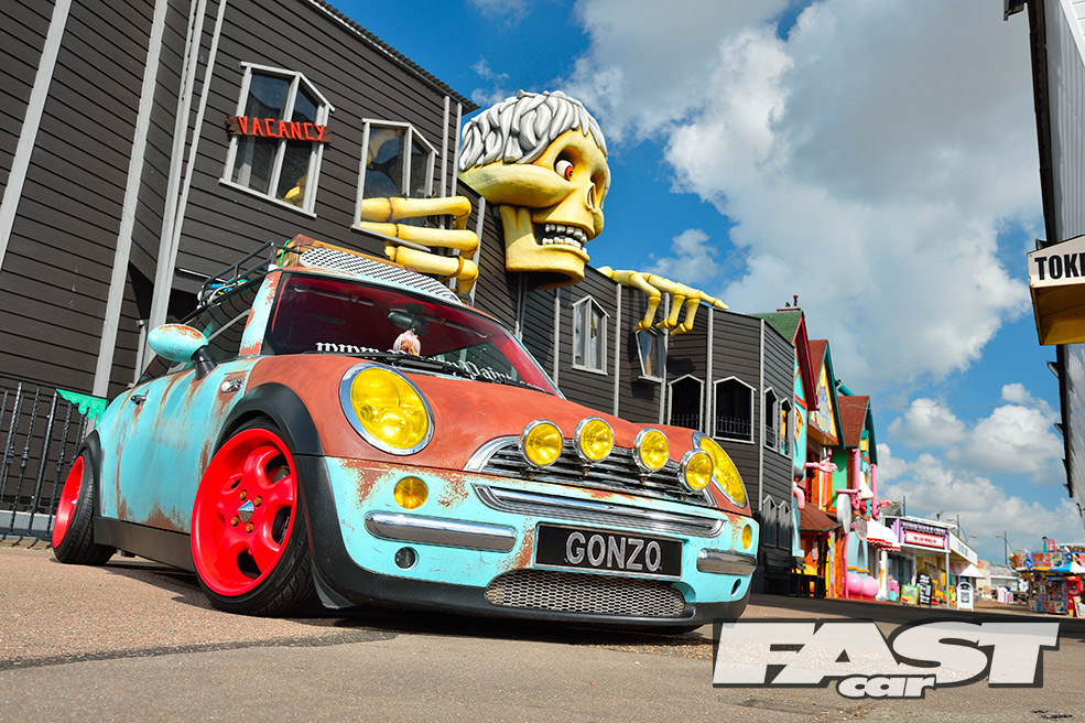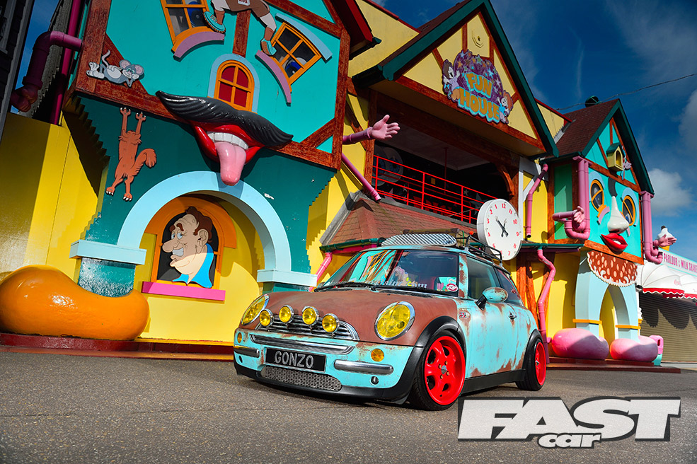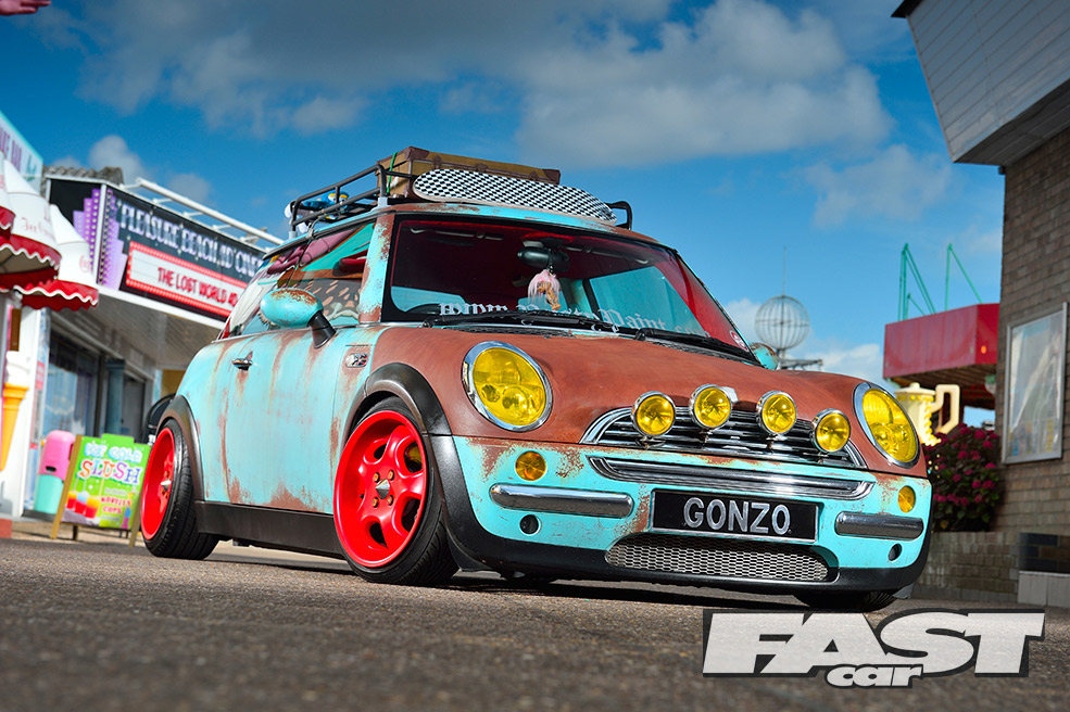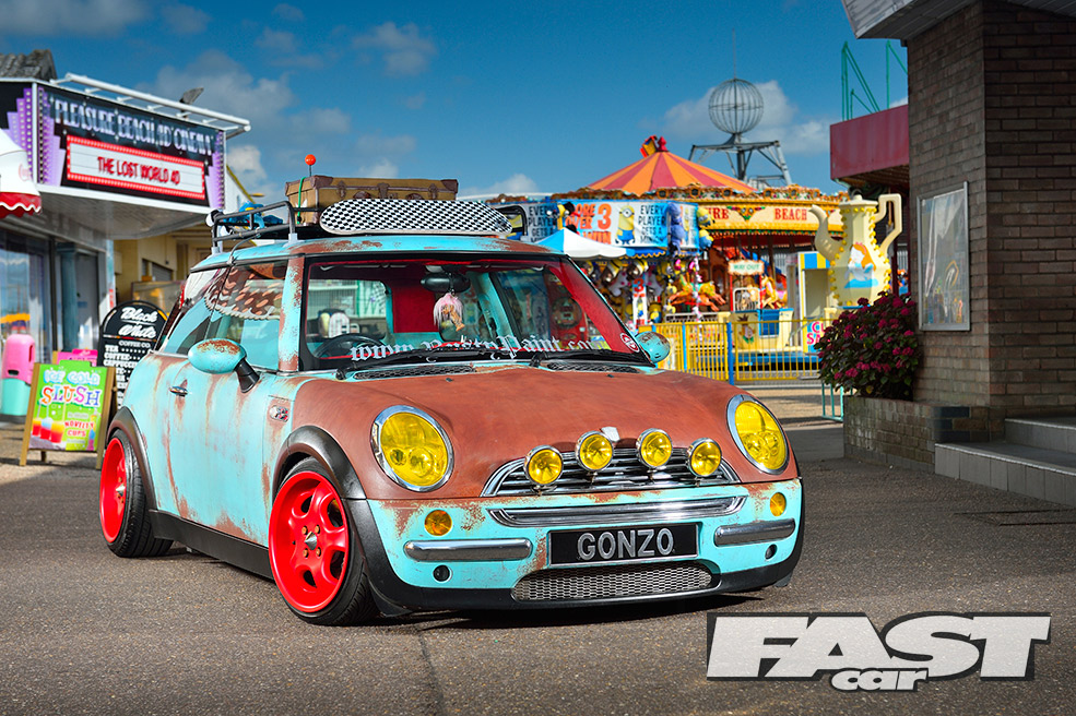 While the ratty exterior settled in nicely, a cuddly Gonzo, that phallic-nosed muppet, was hung off the ’60s roof rack. Attention then turned to the standard interior, which was far too straight-laced for this project. “My father-in-law sadly passed away, leaving three classic Minis rotting away in his front garden,” says Karl. “So I salvaged a pair of front seats from one, some badges from another and gave the rest to a local Mini club.”