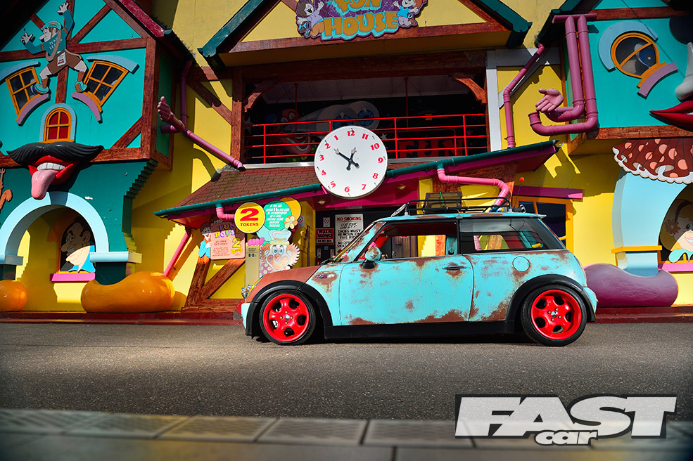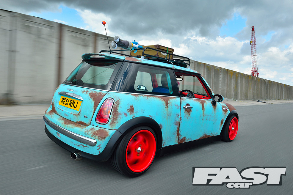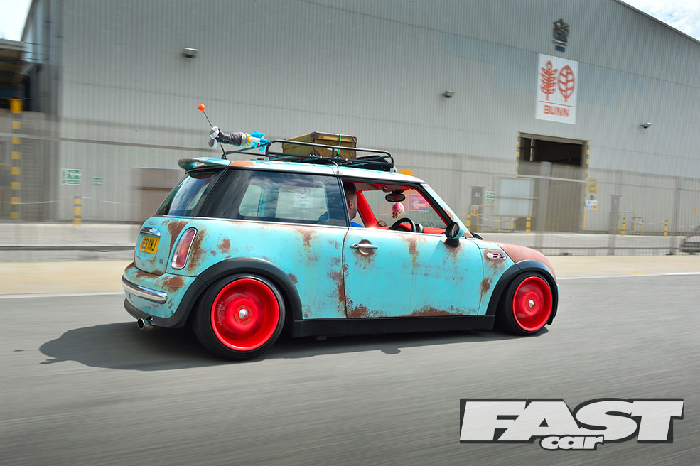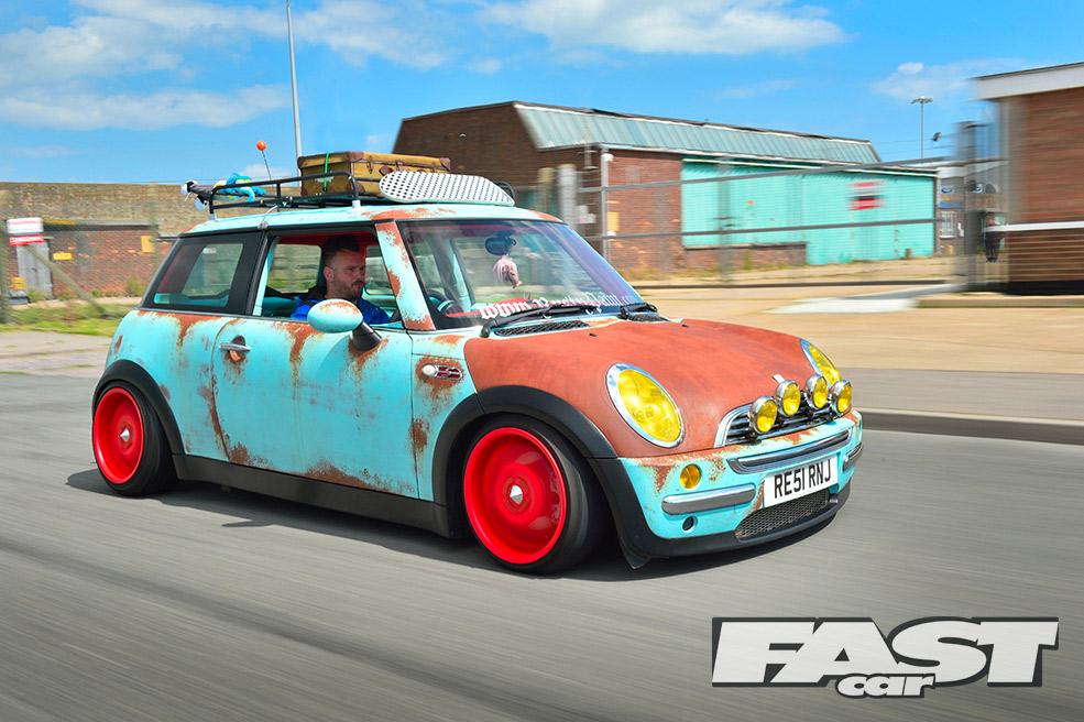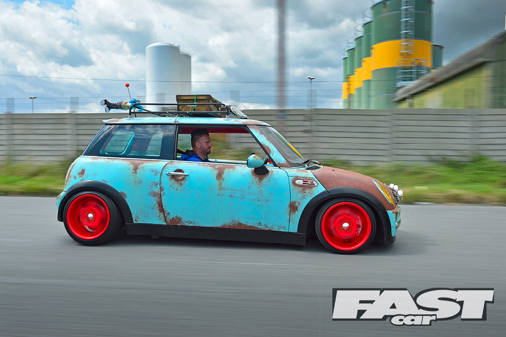 “On the VW scene it didn’t matter what I did, as someone had probably done it all before,” says Karl. “It was getting a bit much. I could never compete against all the chequebook builds. Where others may have been spending 30-odd grand on a car, I wanted to get to the same levels on just a few thousand.” Enter the sun-bleached paint, roof-top trinkets and rusty panels of the rat look – a style very few people had tried on a MINI before.