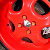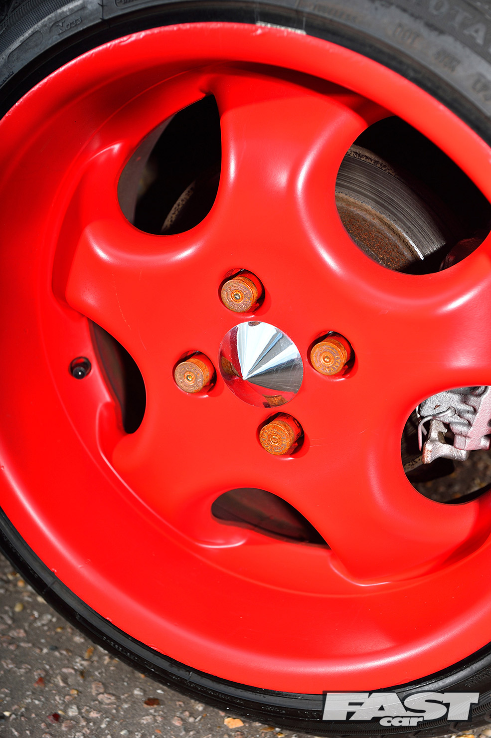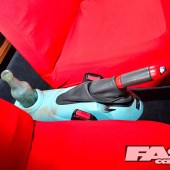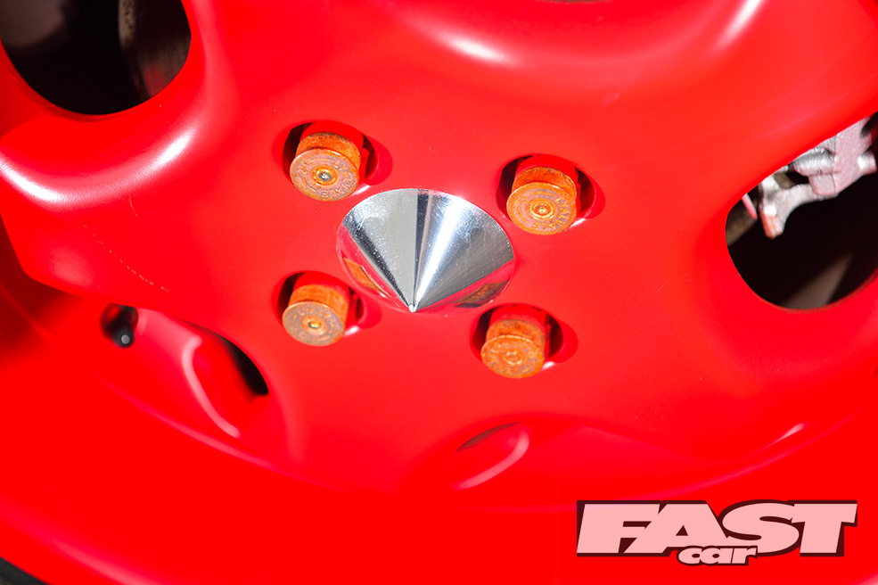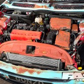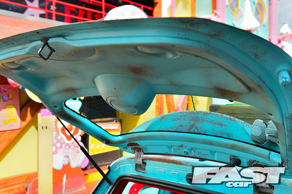 First came the unusual alloys, a set of classic 16-inch RH Cup wheels, staggered with some serious poke on the rear. To accommodate the wider rear wheels without tearing off the standard arch trims, adjustable rear lower arms extend outwards for some much needed negative camber. Then with the low-profile stretched tyres, 165s front and 195s rear, Karl had to slam the suspension to perfect the look.