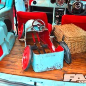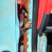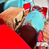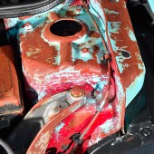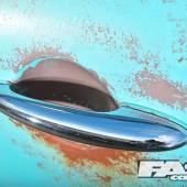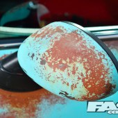 The brown base coat was then faded back through the blue with some wet sanding and patience, to give that pantina look to the body. Karl gradually worked his way across the panels, before applying additional rusty paint detailing around the brown stains, going all-out on the clamshell bonnet. The rusty paint is an American thing, a top coat containing minute particles (not just iron filings) that naturally oxidise to create a rusty finish. So the panels aren’t rotten as such, it’s more of a lacquer gone wrong!