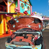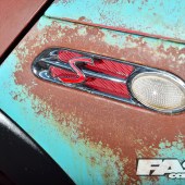 The main advantage between this and manually sanding off the paint to bare metal is that the panels are still protected underneath, so you’re not removing strength. The special paint even works on plastic trim, confusing the crowds with rusty modern bumpers.