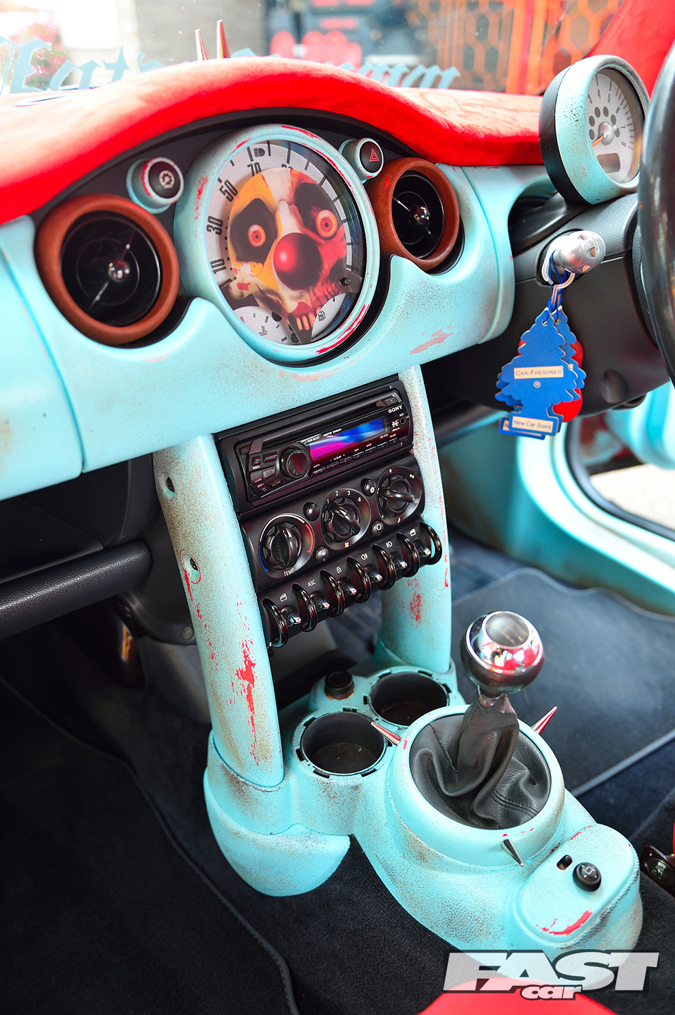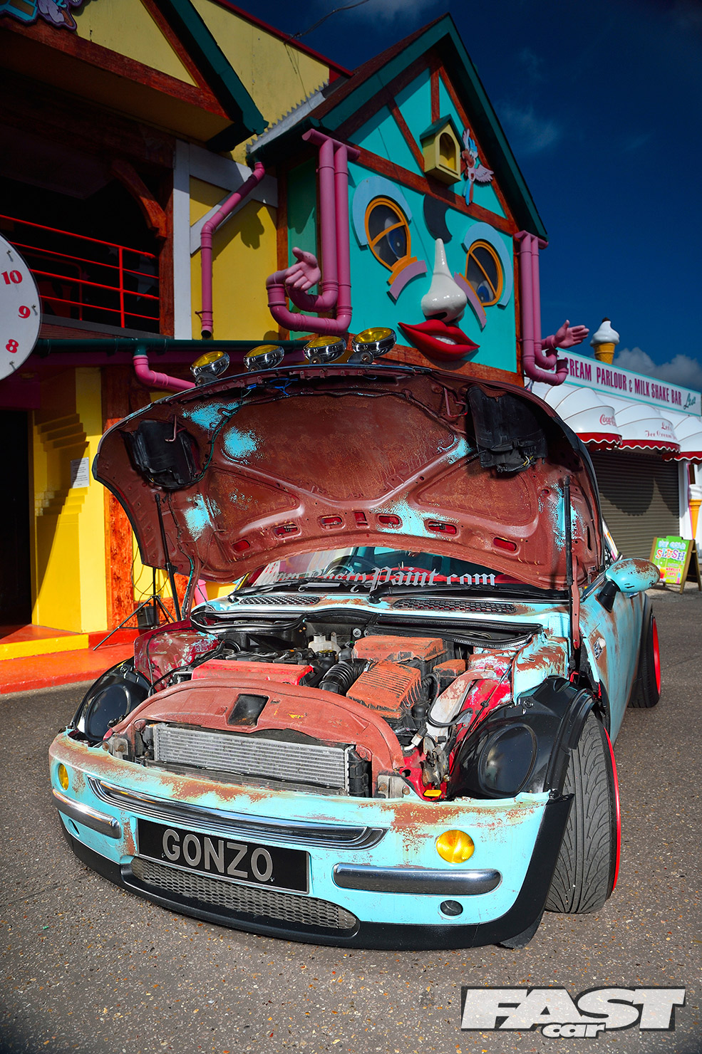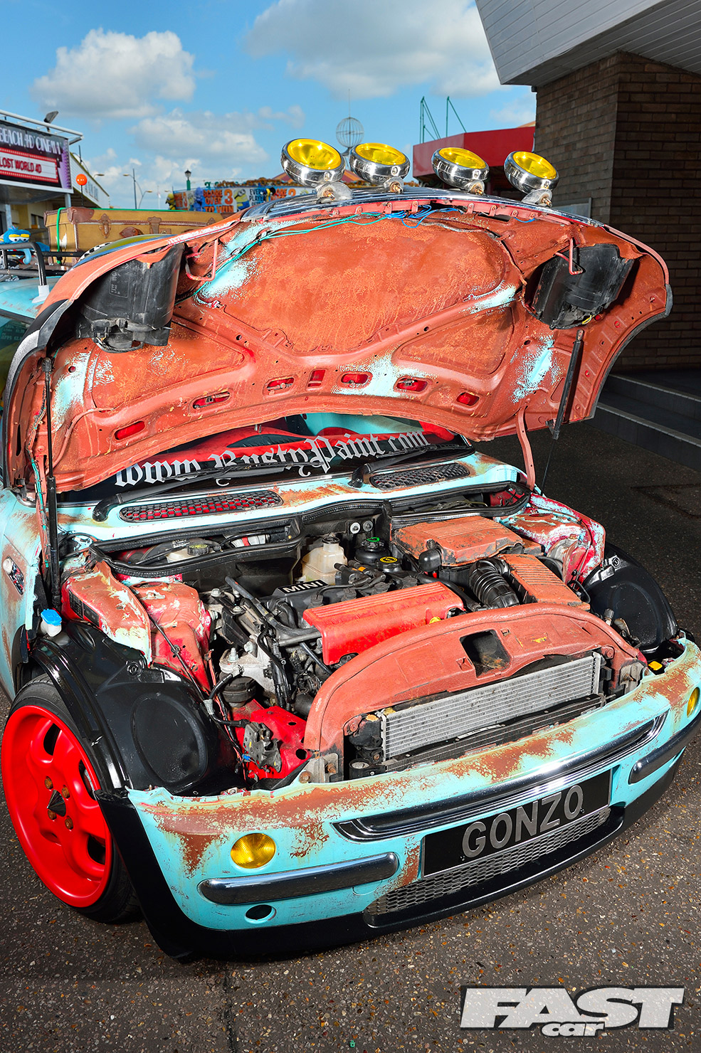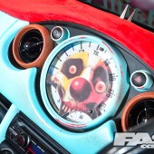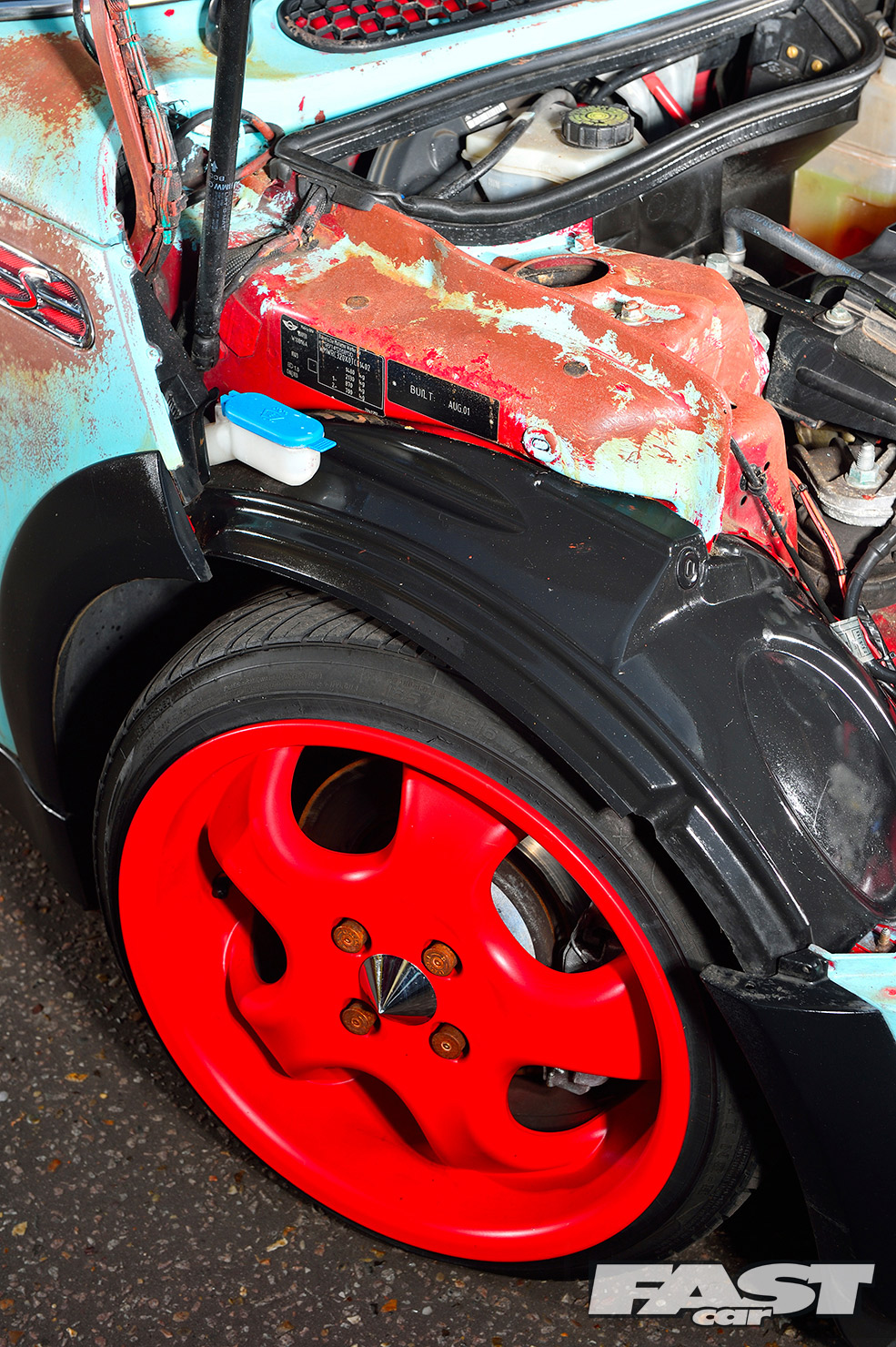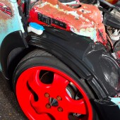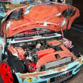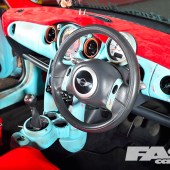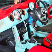 However it took Karl over a year to pluck up the courage and go all-out rat on his new ride, a shiny red Cooper from the first year of production. Just adding a few splodges of rust wouldn’t work, as a half-arsed rat can look more student fleapit than US theme park. “The KW coilovers went on first and I edged towards a Euro look, with a chequered wrap on the boot and A-panels,” says Karl. “But with a shiny car there’s only so much detailing you can do, plus I do that all day at work. I decided to think up the more crazy ideas.”