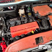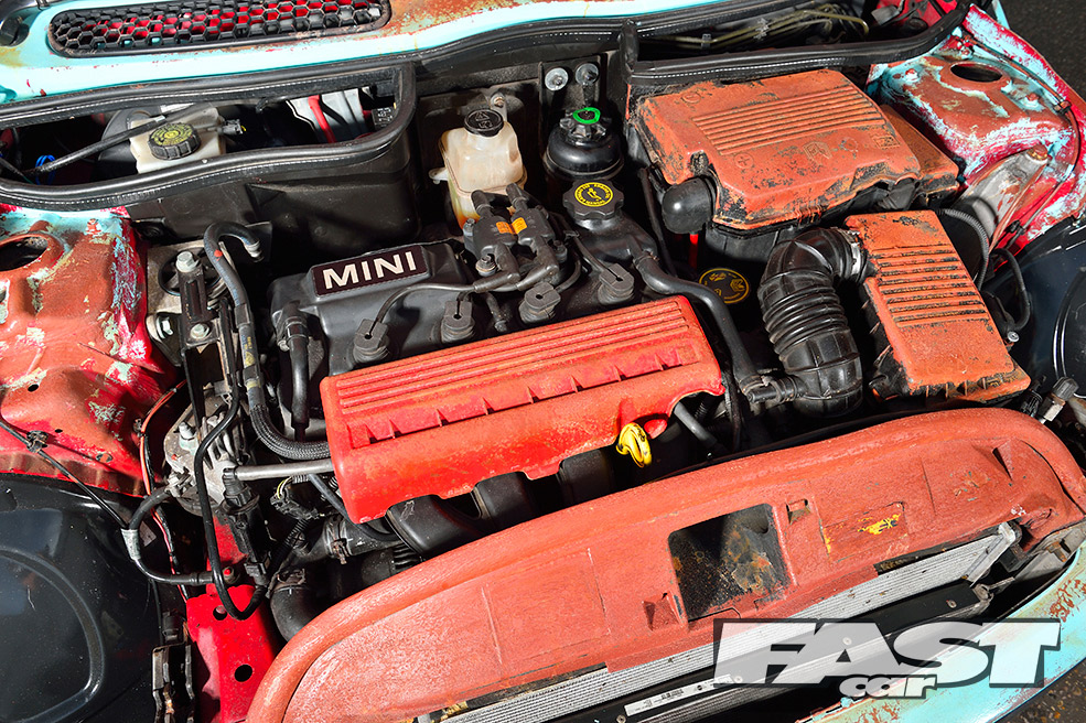 Standard 1598cc 115bhp Cooper engine; K&N air filter; custom home-made stainless steel straight-through exhaust; standard five-speed manual gearbox.