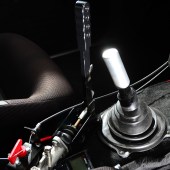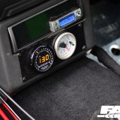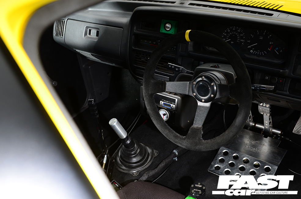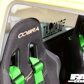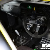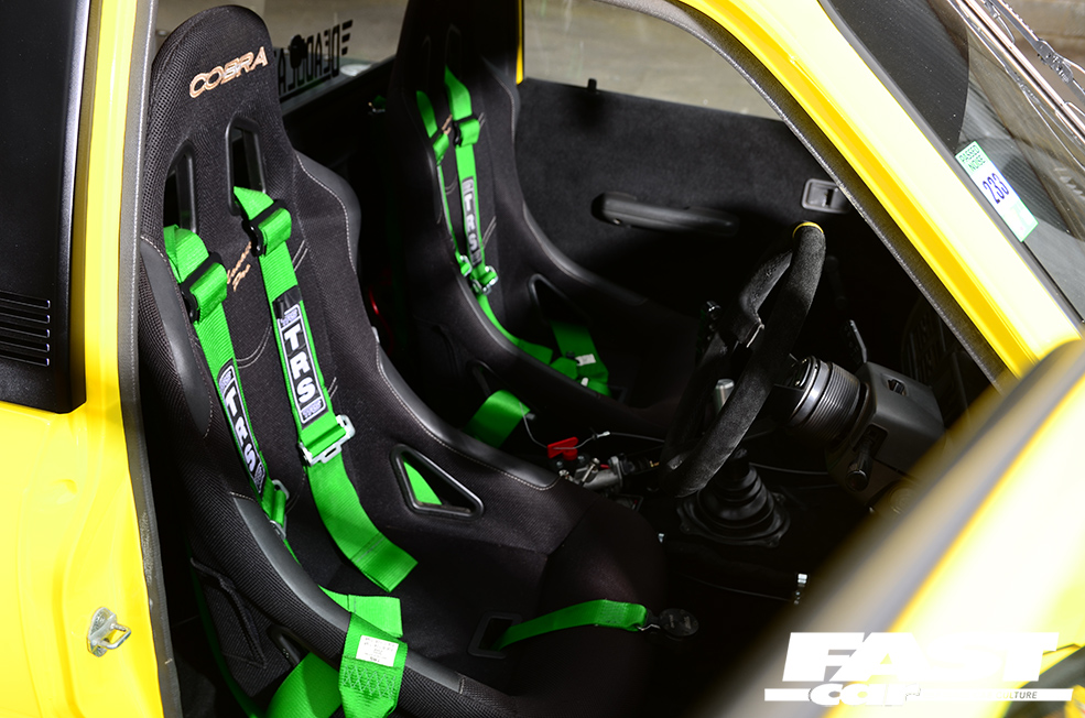 Custom black carpet and panel covering by XDR – inc. doorcards and headlining, side-mount Cobra Monaco seats on custom frames, green TRS 5-point Magnum harnesses, E36 328i dials, custom dash insert for boost and AFR gauges, boost controller and meth kit switches, fusebox and water control mounted on rear plate, race battery behind passenger, electrical cutoffs and fire extinguisher system, custom gearstick, hydraulic handbrake, OMP steering wheel and boss