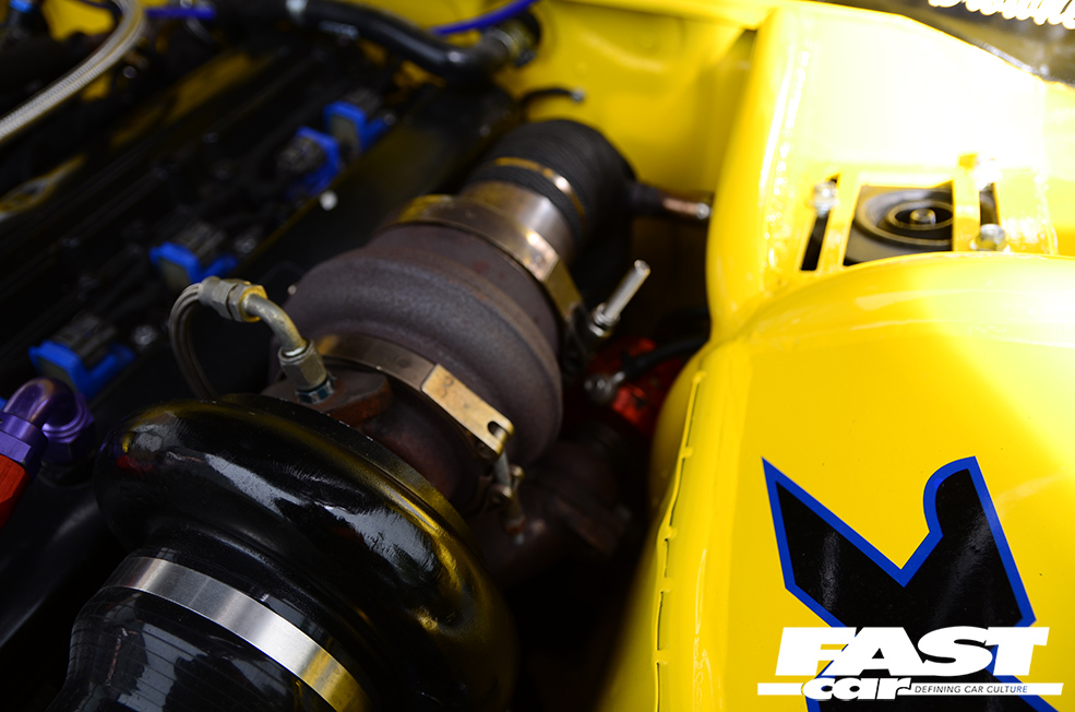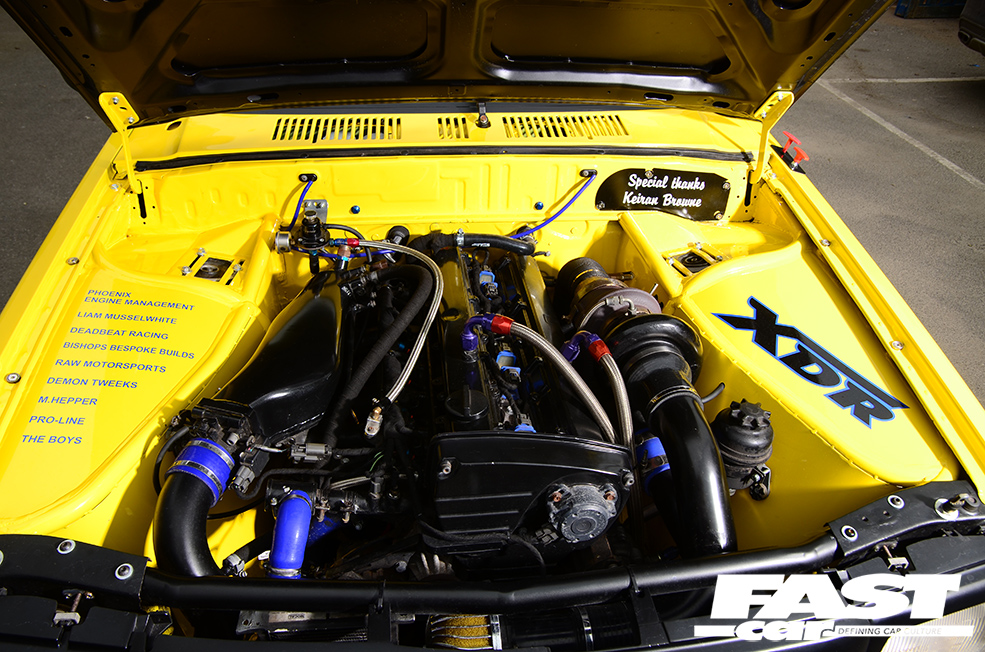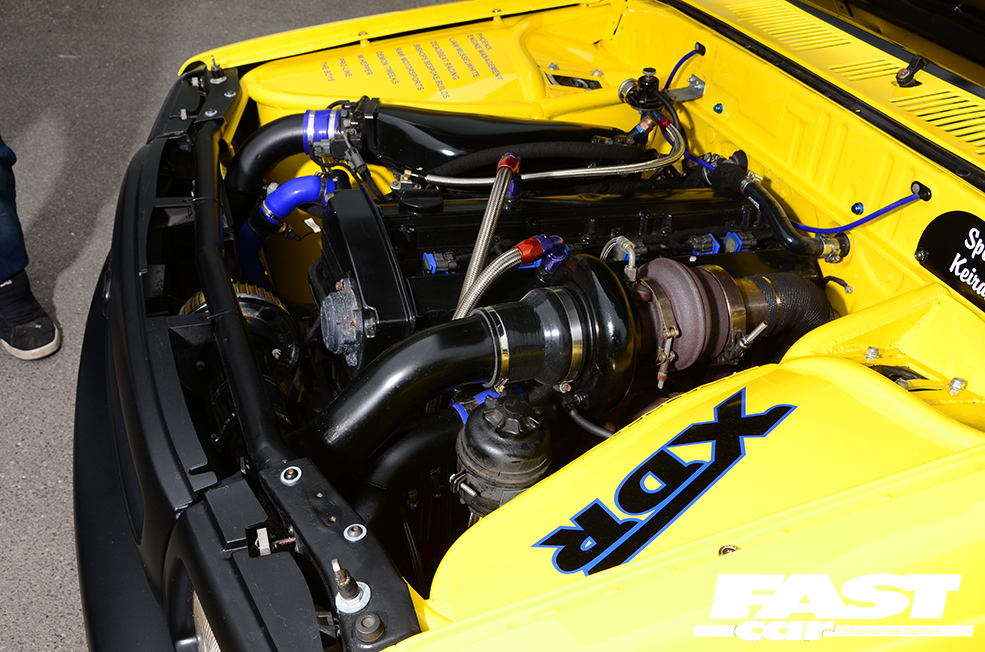 RB20DET 2.0-litre straight-six turbo, ACL internals, Cosworth head gasket, head drain kit, Plazmaman front-face inlet manifold, 550cc Bosch injectors, HY35 turbo with welded internal wastegate, 55mm Tial external wastegate with screamer pipe, Spec tubular manifold, water pump removed and thermostat modified, rear-mount radiator setup with full Davies Craig water management system inc. control ECU and fan set, custom front-to-rear radiator pipe setup, XDR custom radiator mount, XDR custom front-mount intercooler and pipework, full custom wiring harness with standalone electrics for ECU, water system, boost control and management with custom fusebox (all by Phoenix Engine Management), PMC Motorsport gearbox adaptor with custom flywheel, 6-paddle clutch and race pressure plate, E36 M3 gearbox, E36 2.8 rear diff, custom propshaft designed by XDR and built by Firow Propshafts, A’PEXi Power FC – mapped by Richard Bell, custom intake system and exhaust system by XDR, Cooling Mist meth kit