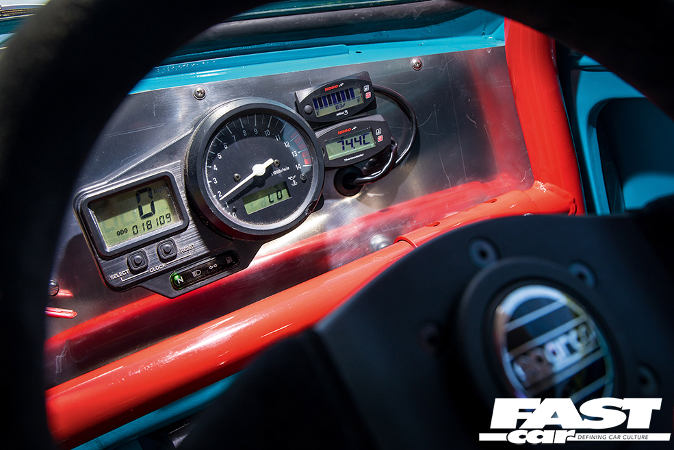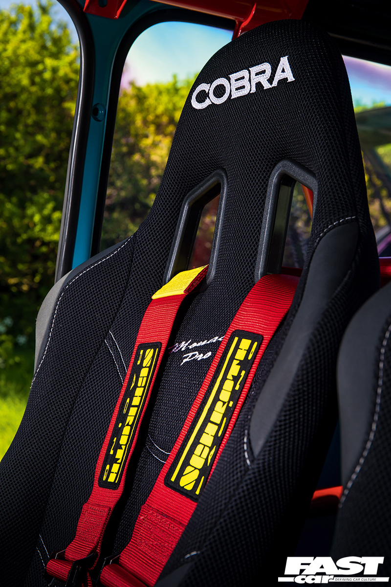 The stripped-out interior is now an extremely functional affair that makes the job of handling over triple the standard power as un-distracting as possible. It’s made up of an alloy dashboard with the Yamaha R1 instruments cleverly taking pride of place. There’s also a Sparco 300mm steering wheel, and the finishing touch, a set of bottom-hugging Cobra Monaco Pro bucket seats, with Schroth four-point harnesses.