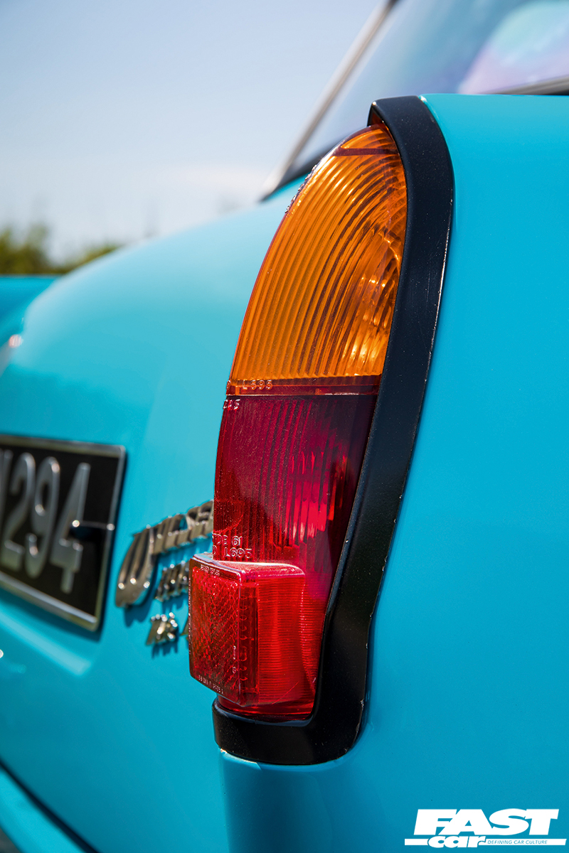 Outside, the bright blue hue is far from subtle of course, but it works amazingly with the black roof and de-chromed details. It all seems to help bring this car bang up-to-date. It’s pretty simple on the other styling mods too. Tom has installed a stock Mini bumper at the front to go with that distinctive grille, and the only other change he’s made is fitting a set of Mini Special arches and more period-correct JBW Mamba wheels (with Yokohama AO48R tyres). Were the Mambas a nod to the Wolseley’s age? “Not really, I’ve always liked Mamba wheels, and never owned a set before. But they have nice big gaps between the spokes, which show off the KAD brakes. The wheel arches are a necessity as the rims do poke out a bit!”