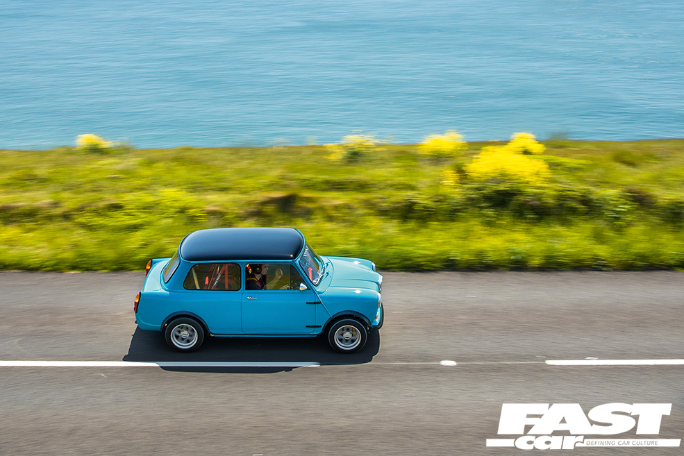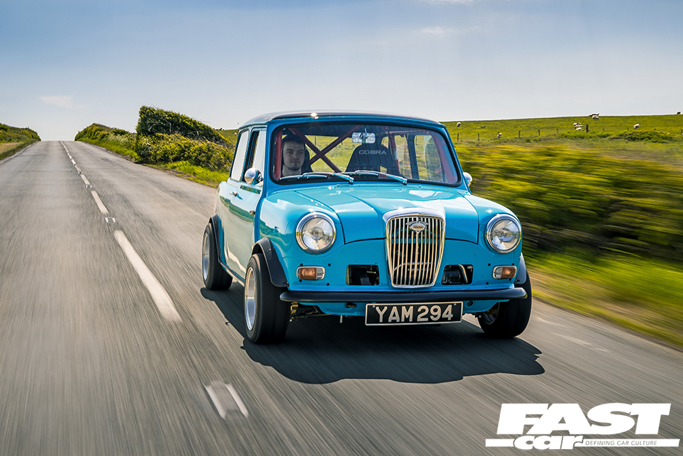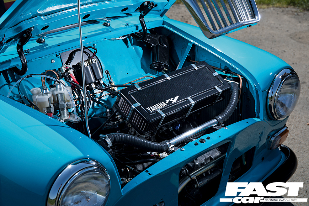 Why is the owner of this bright blue restomod Wolseley Hornet wearing a set of ear defenders and a massive smile on his face? That frantic Yamaha R1 motorbike engine that’s now wedged under the bonnet will probably explain it…