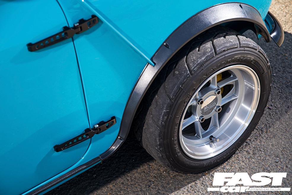 ’65 MkII Hornet body, full re-spray in Porsche Miami Blue with gloss black roof, de-seamed rear valance, Mini Special wheel arches, standard Mini front bumper, smoothed-over waistline trim components