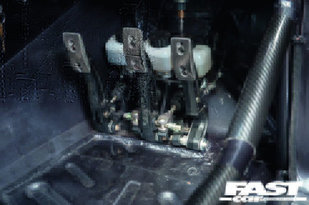 7 and 9×15-inch Compomotive ML wheels in matt black, 195/45R15 and 245/40R15 Avon CR500 tyres, AVO coilovers, Alachi front crossmember, Cosworth front hubs, custom adjustable TCAs and compression struts, drop link anti-roll bar, alloy top mounts, Corsa electronic power steering, custom five-link rear end AP Racing CP5040 callipers, two-piece 305 mm J-hook discs, MK Motorsport alloy bells and calliper brackets, Ferrodo DS3000 pads (front), Cosworth 4×4 calipers, two-piece 300 mm grooved discs, alloy bells and calliper brackets, Ferrodo DS2500 pads (rear), Tilton 600 floor mount pedal box, Tilton cylinders, hydraulic handbrake, Hurst electronic line-lock, full stainless steel braided brake lines.