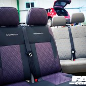 The T5 is a handsome van anyway, but Revo’s graphics pack, a front lip spoiler and a swanky set of Transporterland upgrade seats soon got things looking a bit more circuit-ready. BILSTEIN B14 dampers soon followed, as did a trick Milltek exhaust, lightweight Team Dynamics wheels and sticky Dunlop Direzza tyres. A Forge intercooler and oil cooler would keep temperatures down at full chat and an afternoon of careful ECU tweakery by Revo’s top boffins soon had the engine singing a 220bhp song that would make any builder’s pasty fly off the dash. With the self-imposed deadline of the superb Destination Nürburgring event to get to, there was no time to source a set of Forge’s much-needed upgrade brakes for the T5, so the team replaced everything with OEM discs and pads and crossed their fingers.