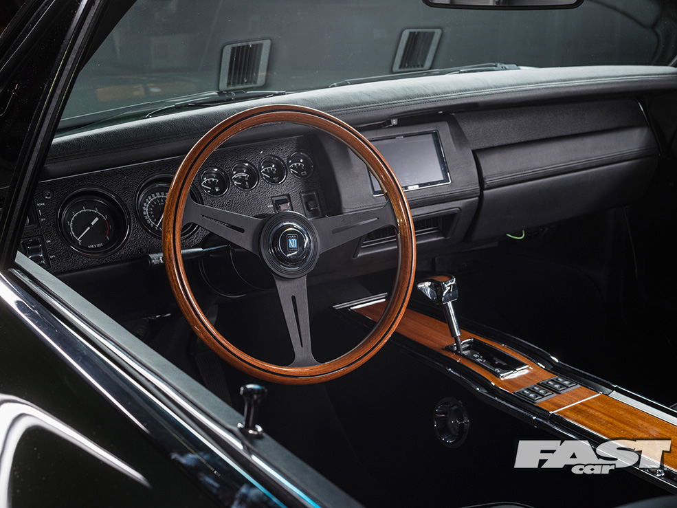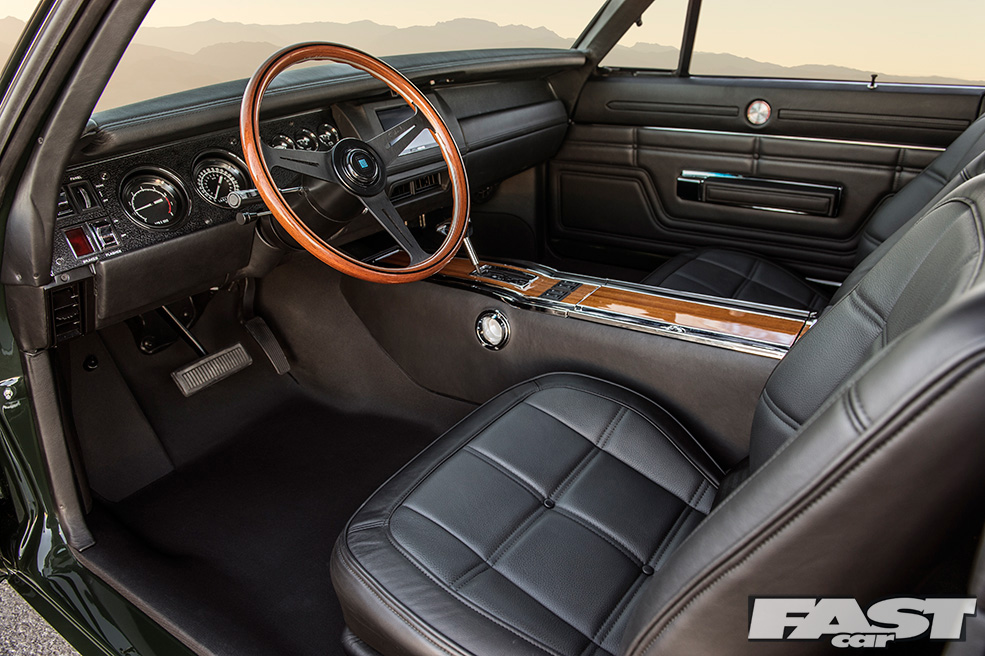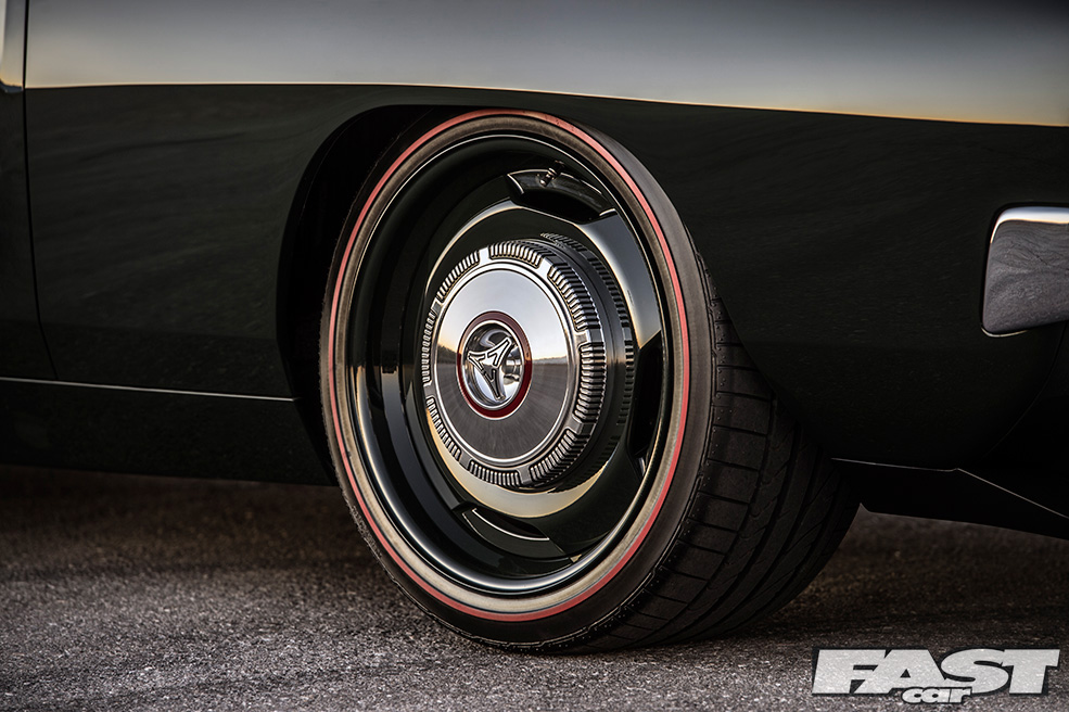 The side rockers were lengthened and the quarter panels were lowered and extended, and a front valance that appears lower than factory standard was added. “I think it turned out much better and we stayed true to the original design,” said Erlend. “And it was also cheaper!” A Detroit Speed Hydroformed subframe sits below the body with rack-and-pinion steering, front sway bars and four-link rear suspension. Performance also comes in the form of a Wegner Motorsports 6.4-liter Hemi engine. The motor maintains perfect temperatures with help from Prestone coolant, while custom Flowmaster headers and exhaust give the car a robust performance exhaust sound.