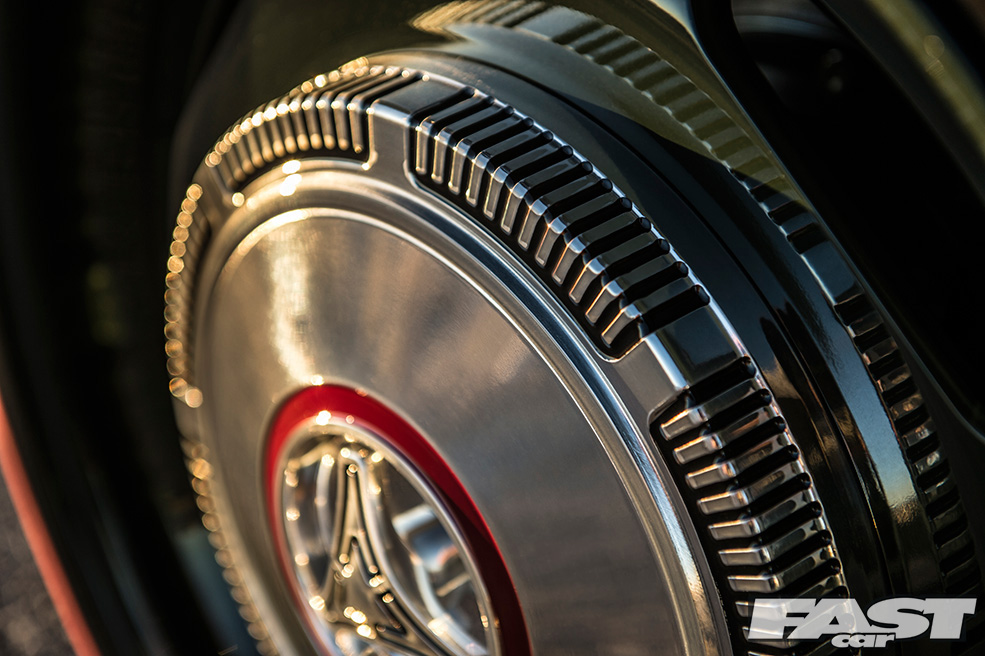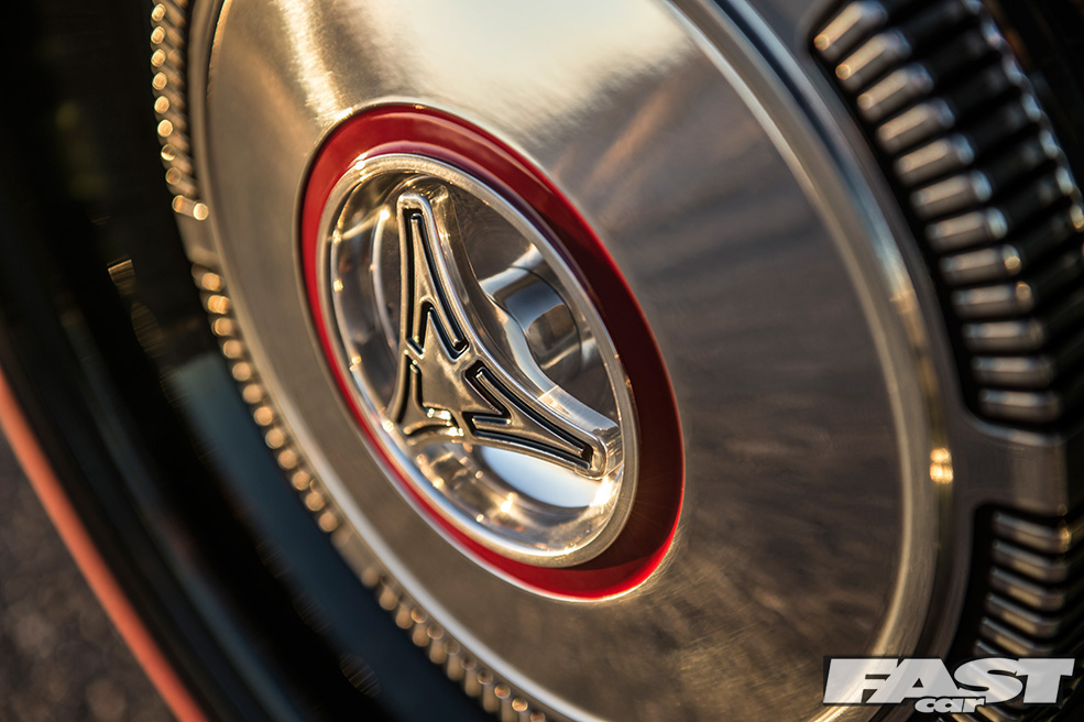 The rear wheelwells were opened up for custom 19-inch HRE machined wheels, size 19×11 in front and 19×13 at the rear, with custom Ringbrothers hubcaps. There are Michelin tires in size 285x35x19 in the front and 345x35x19 in back. “I actually wanted smaller wheels and not as wide,” said Erlend. “But the Rings did a good job of talking me into going larger. It also makes sense to have wider tires for traction, and also going with the classic-looking wheel; it’s really subtle.”