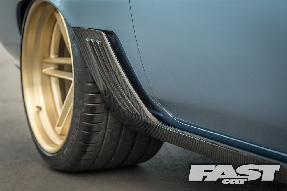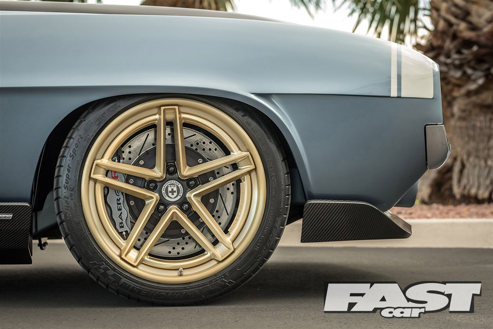 The Rings worked with the folks at HRE Performance Wheels in California to design a custom set of forged wheels sized at 19×10 in the front an 20×13 at the rear, inspired by the IROC-Z Camaro wheels of the ‘80s and wrapped them in Michelin Pilot Super Sport tires measuring 275/35/19 up front and 335/30/20 out back.