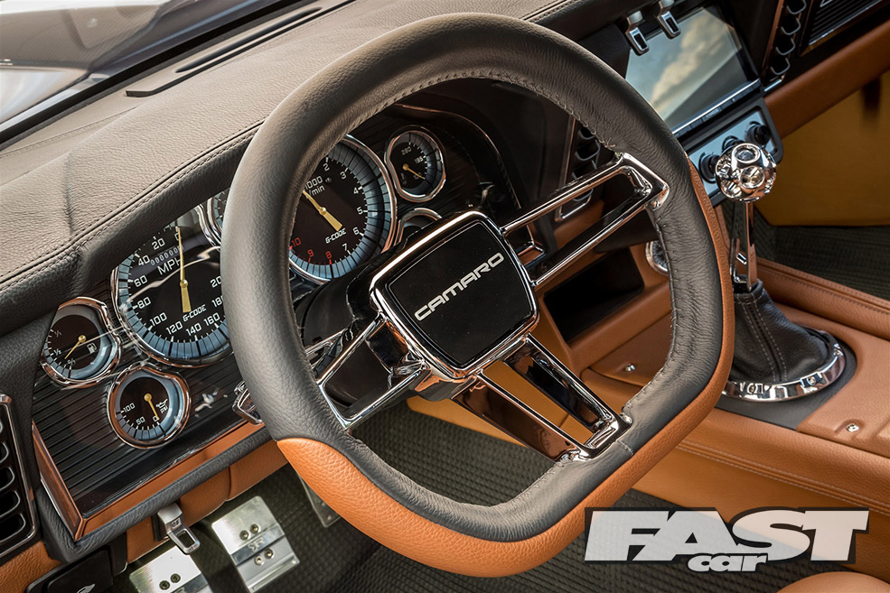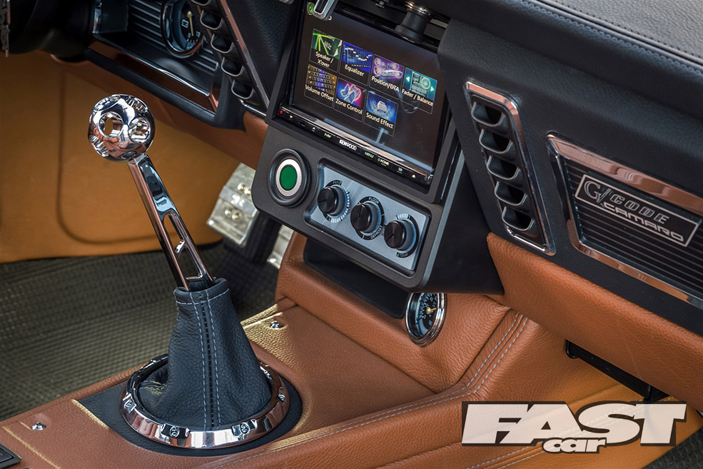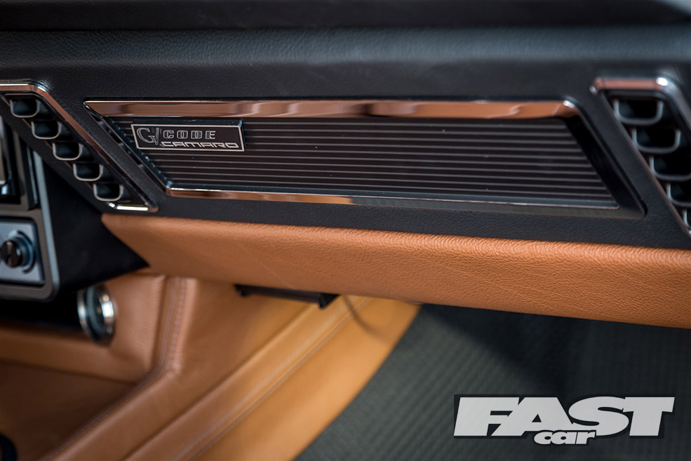 The cabin of the first generation Camaro was carefully designed with driver comfort in mind. The interior upholstery was custom crafted by Upholstery Unlimited and is kept at the perfect temperature with a Vintage Air climate control system.