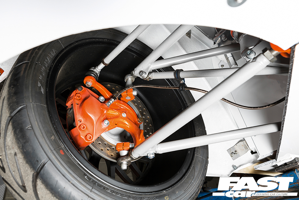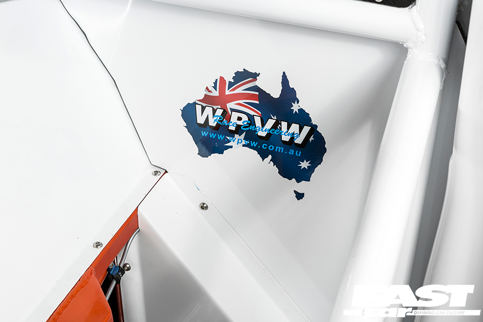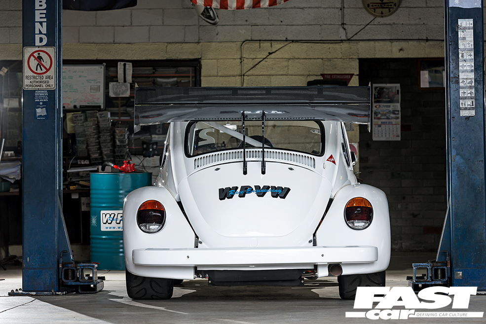 With a tidy, simplistic interior coming together nicely to complement that unique (not to mention absolutely bonkers) central-seat setup, the final piece of the puzzle was for Wayne to get the outside of the car looking every bit as special as it deserved. He opted to use as much fibreglass as possible to reduce weight and make things easier to repair after the inevitable dings out on track. A complete Ice White Beetle body was soon sourced, topped off with the all-important bubble arches to house those huge rims, as well as that protruding front splitter and huge carbon fibre rear wing out. With those uncharacteristically subtle graphics, the overall aesthetic remains relatively understated considering what madness lies beneath.