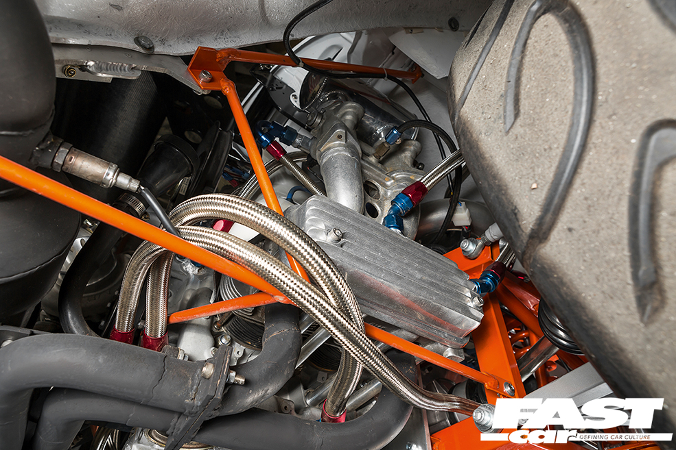 Let’s look at that engine to start with. Sticking to the VW-based blueprint that was originally planned, it’s clearly one of the most extreme versions of an air-cooled lump anywhere in the world. Loosely based on a 1.8-litre Type II bus layout, it features an all-new, stroked aluminium block with forged internals, such as a Scat crank and Carrillo pistons, all tied into racing heads that house only the lairiest of camshafts. These lumpy sticks are vitally important too, chiefly because they allow for some serious boost to be added into the equation.