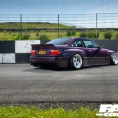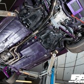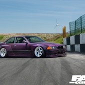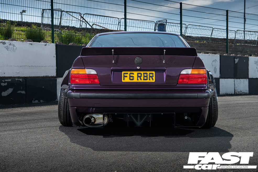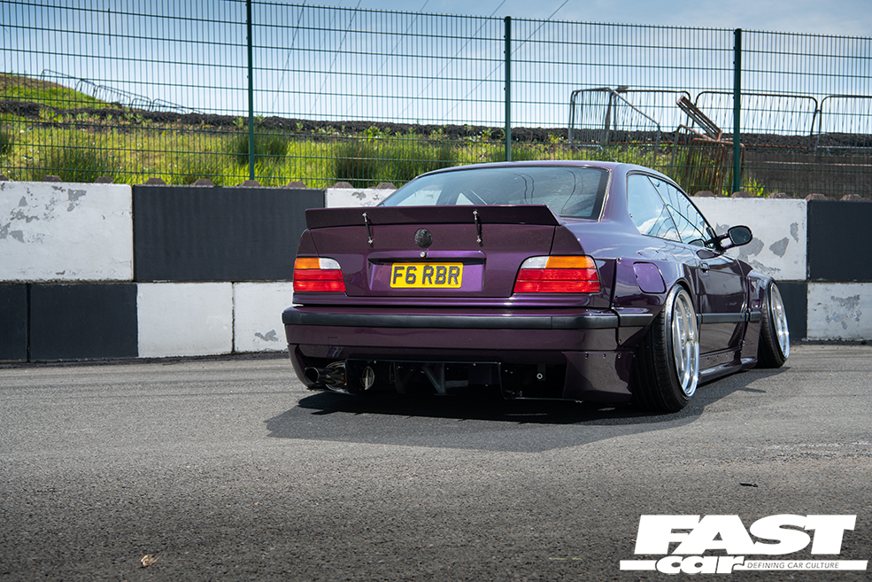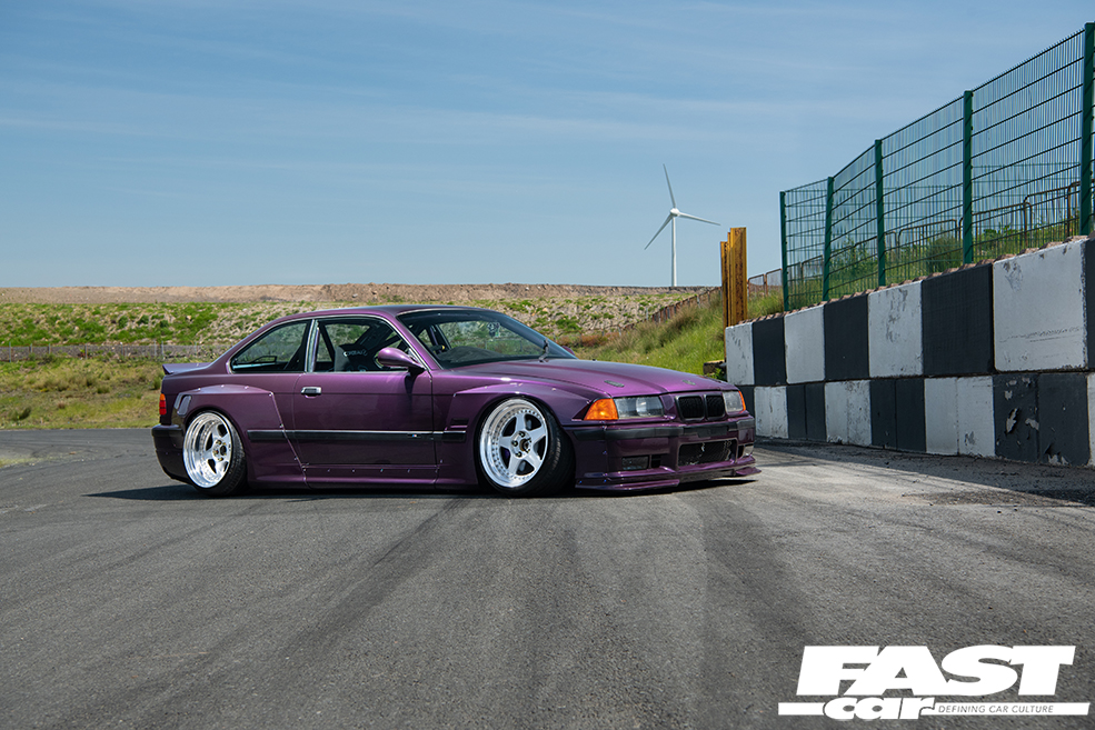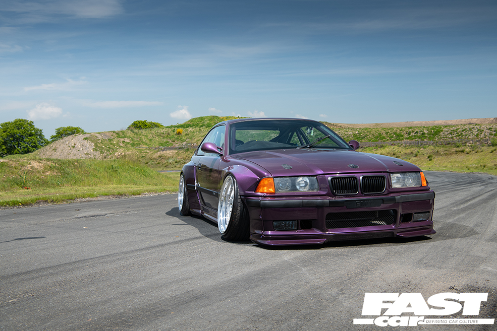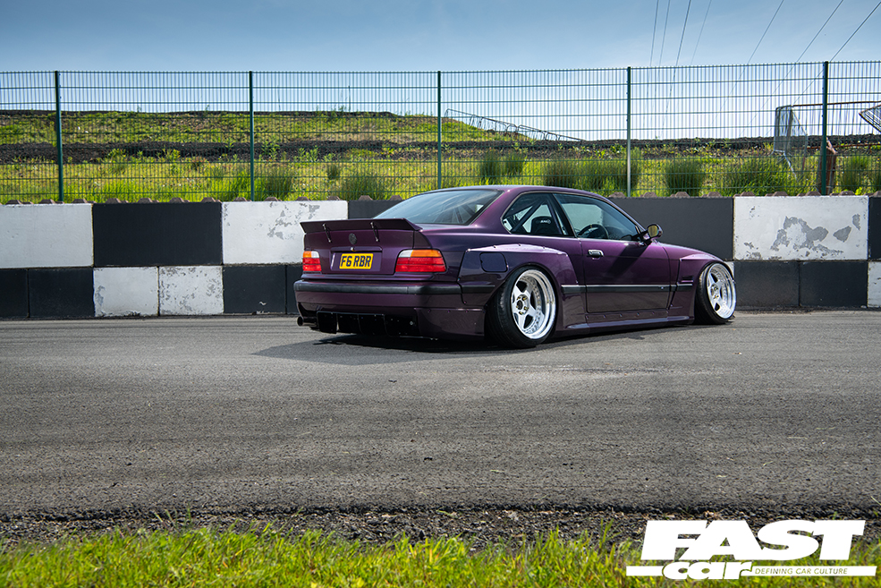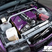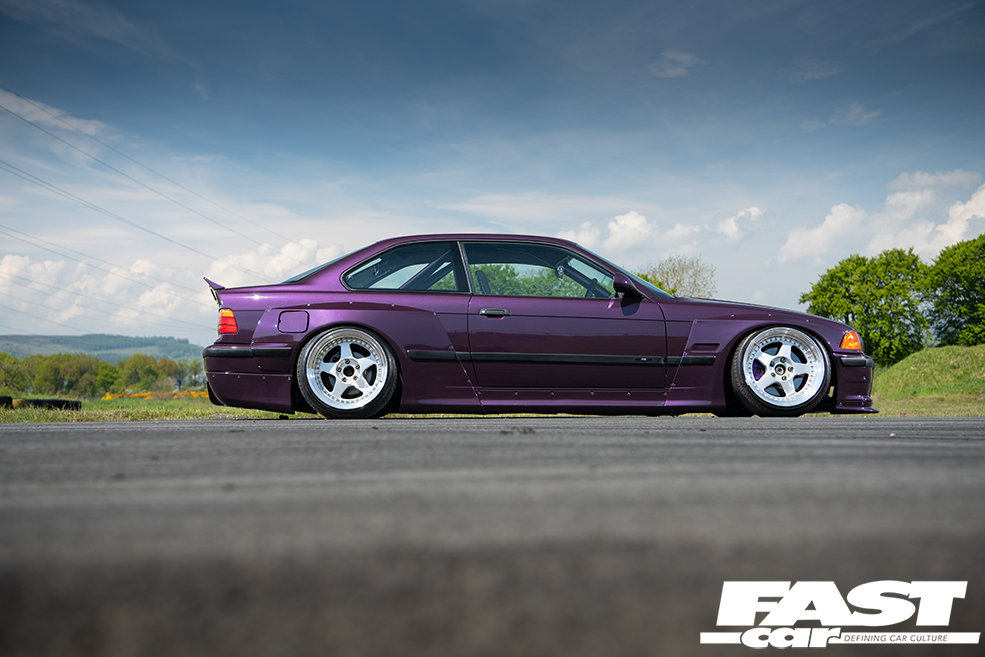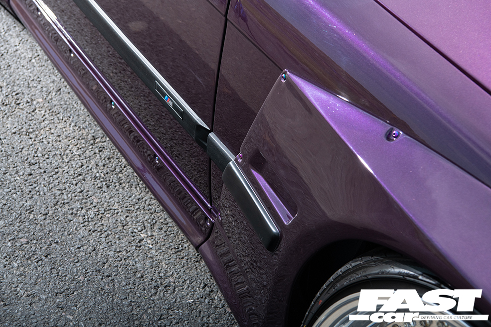 This is the area in which the inherent philosophy of quality and correctness comes to the fore, because that paint is no ordinary shade of purple: it is, in fact, Purple Silk, taken from Rolls-Royce’s own palette. Tastefully offset by a Nardo Grey engine bay and highlights, the Purple Silk does a lot of heavy lifting in terms of demonstrating to passers-by just how serious a build this is. As if having a E46-engined Rocket Bunny BMW E36 didn’t do that strongly enough!