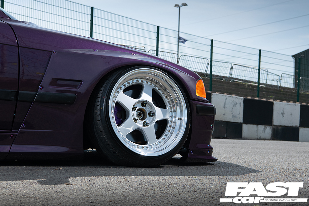 “The steering kit is a full-on drift set up from SLR,” he explains. “The car’s running an M3 purple-tag rack, along with an Eibach anti-roll bar at the front. Once everything was test-fitted and set up it was time for paint, so it moved from Driftland garage down to Neil at KDKustomsUK. Everything was stripped out and work started on getting the bodykit perfect, along with finding the right wheels – I ended up with two different sets, twelve wheels in total. It was more slow-going getting the right people together to get the little jobs ticked off, but in the end we had the bodykit and everything all sorted, and it went in for paint.”