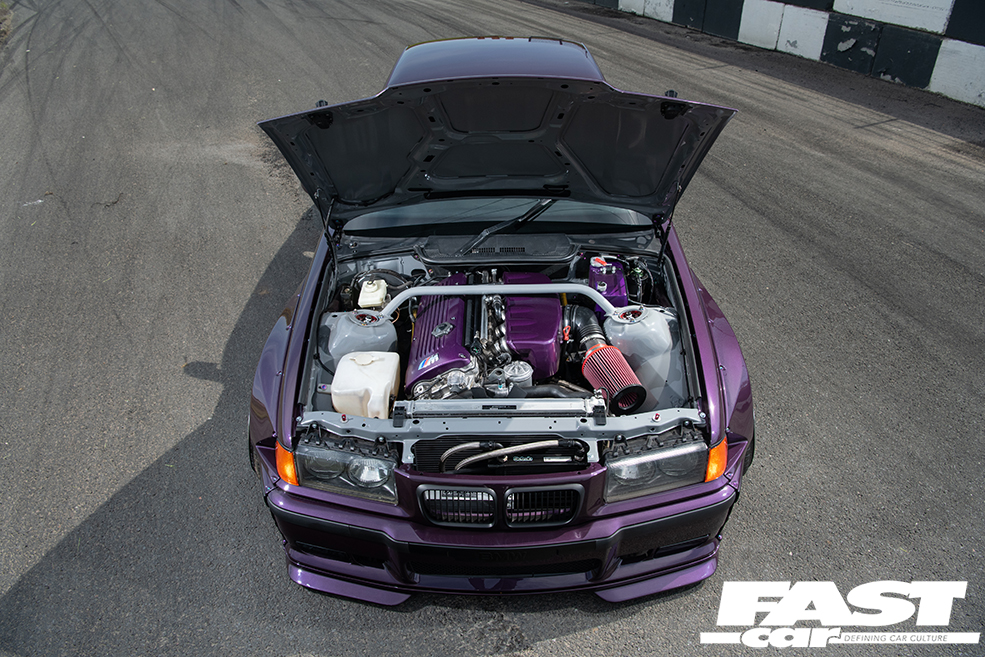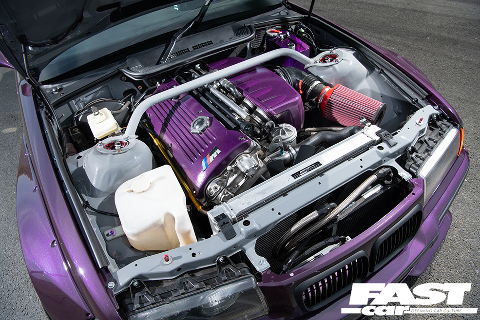 3.2-litre straight-six S54 (E46 M3), Radium fuel rail, Radium fuel pump, BMC air intake, Mishimoto radiator, Setrab oil cooler, Mocal oil cooler