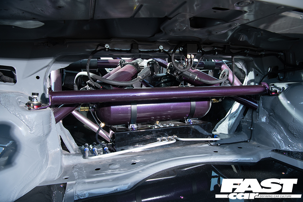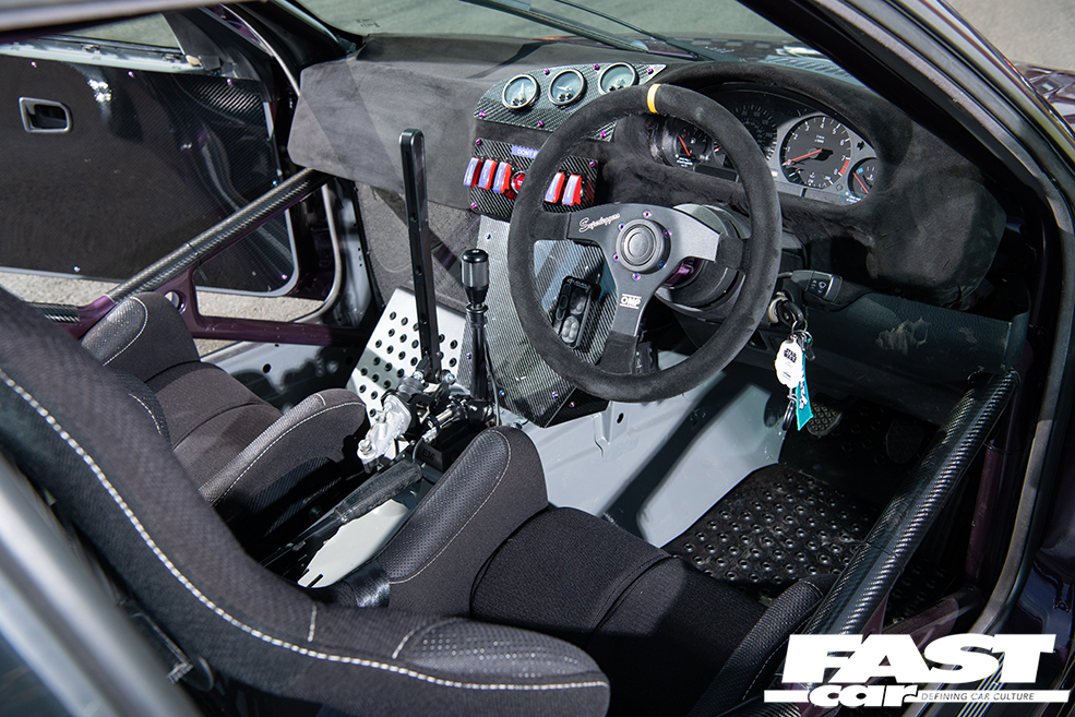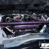 “At first, the idea was simply to put together a really well-specced drift weapon,” he says. “But soon enough that evolved into this drift/show/road idea. Once I started really getting into it, I began looking at ways to make it stand out, and the replica Rocket Bunny widebody kit popped up on my radar. That was quickly ordered, and I then decided to stick a cage in and do a full track-style interior. It was a little slow-going waiting for parts and the right people for getting the cage done; of course, with the kit ordered and a long list of parts growing, I thought ‘why not add air to the list?’, and decided that it should be bagged because that’s something you just don’t do with a drift car. But why not give it a go, eh?”
