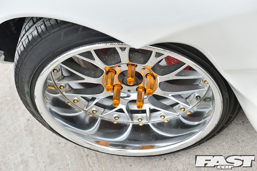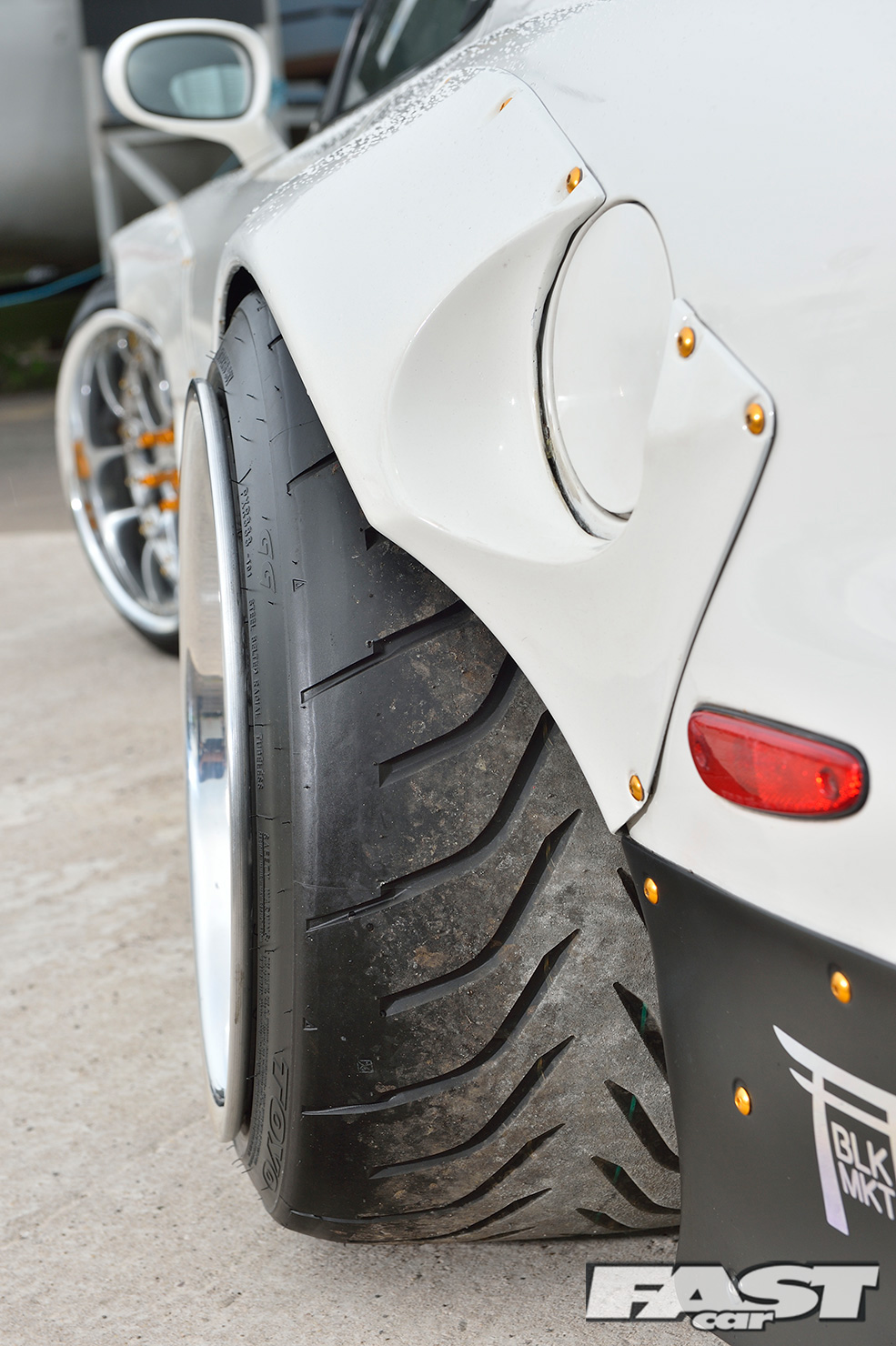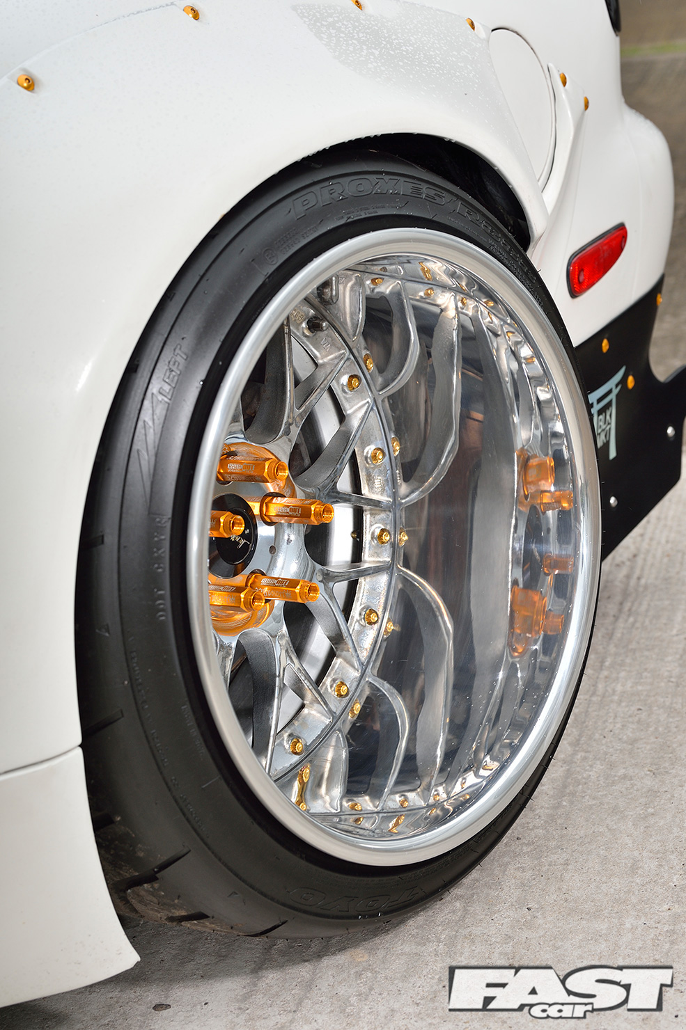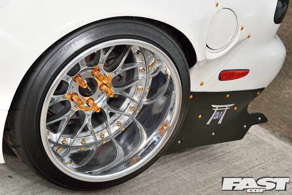 Problem was, they were nowhere near wide enough for his newly-built monster. “They were perfect for splitting and re-lipping, though” he explains. “I used my experience from my career as a metrologist to get the perfect wheel specs to the very last millimetre…” Using his highly sought-after skillset of being able to identify the exact sizes parts need to be to work, he soon came up with the winning formula for his RX…