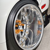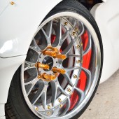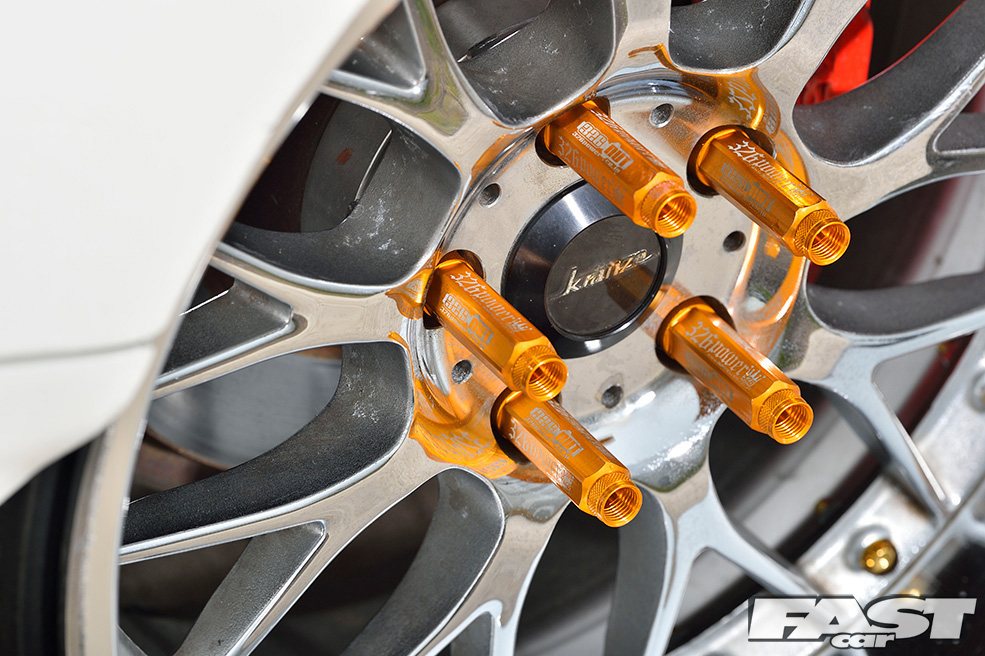 CST adjustable coilovers all-round; 10x18in (front) and 14.5x18in (rear) rebuilt Weds Kranze ERM 3-piece split rims with 326 Power 9cm gold duralumin wheel nuts and gold M8 wheel hardware; Toyo R888 semi slick tyres.