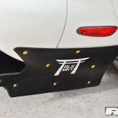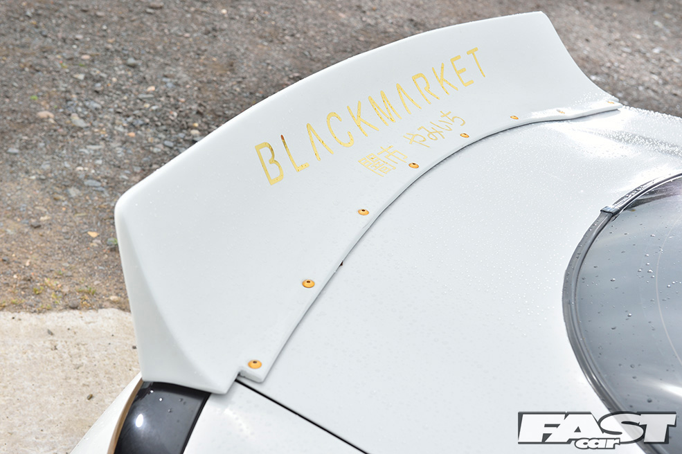 Full Rocket Bunny wide-arch body kit (comprising front bumper and lip, side skirts, front and rear arches and rear diffuser); Rocket Bunny ducktail spoiler; Rocket Bunny LED daytime running lights with integrated indicators; anodized gold M6 domed panel bolts; BLACKMARKET DRIVETRIBE/DS Motorsport neo chrome and gold logos; gold towing eye; black tinted rear glass, yellow tinted front headlights.