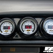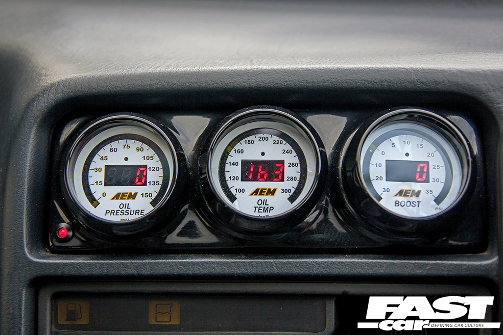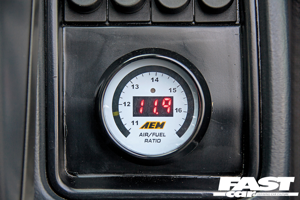Inside, the wing-back Recaros are in fine fettle with an age-related patina to the leather that just feels right. “I had the drivers’ side bolster re-built using leather from a rear bench, but it’s aged now and blends in,” says Ryan. There’s also an RS500 steering wheel, plus a smattering of Rouse Sport logos on the dash and seats to remind you you’re in something special. Open the drivers’ door and the build plaque is there to see too. The only addition to the cabin is a quartet of AEM gauges, which Ryan admits were horrendously expensive, but look stunning.