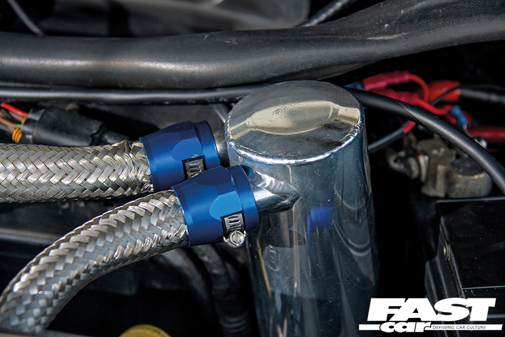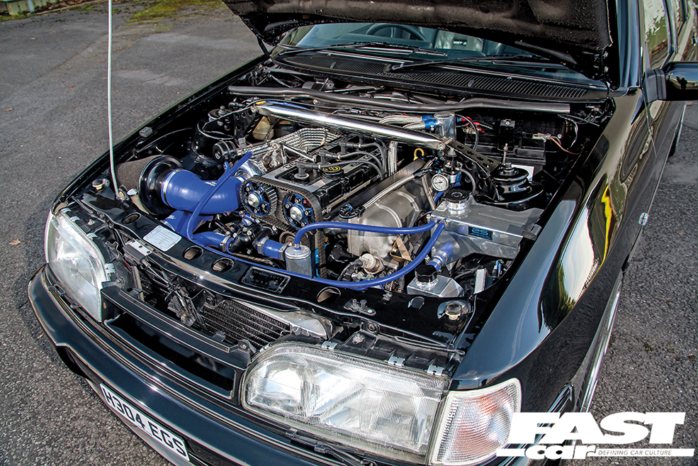 200 block, Nikasil liners, 10-studs, Cosworth pistons, ported and polished head, double valve springs, solid lifters, BD14 inlet cam, Kent pulleys, Hart plenum, grey injectors, RS500 intercooler, alloy radiator, T4 turbo with roller bearing and GTXR billet shaft, 3.5in custom Infinity Exhausts system with 4in tailpipe, polished alloy tanks, Roose silicone hoses, Aeromotive fuel pressure regulator, braided lines, AEM 044 fuel pump
