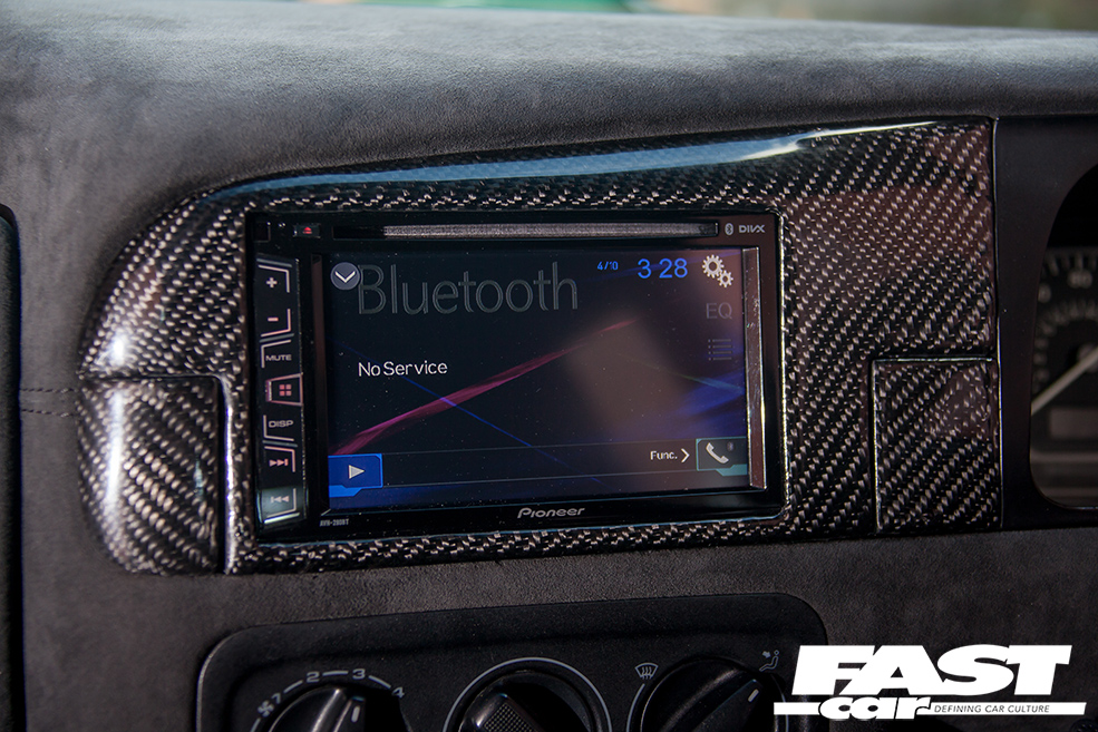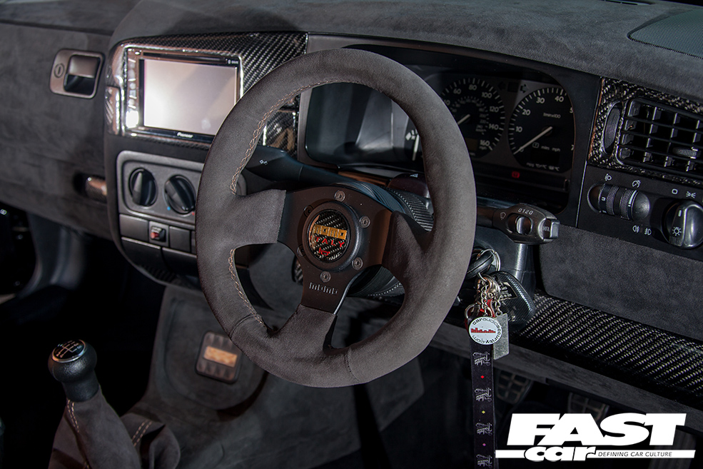 A self-confessed carbon nut, Keil has added the black weave all over the cabin. “I did it all myself,” he explains, it wasn’t easy – especially that custom surround for the doubleDIN headunit.” The rest of the inside has been smothered in Alcantara, including the dash, door cards – even the 280mm MOMO wheel. It really does look special in here.